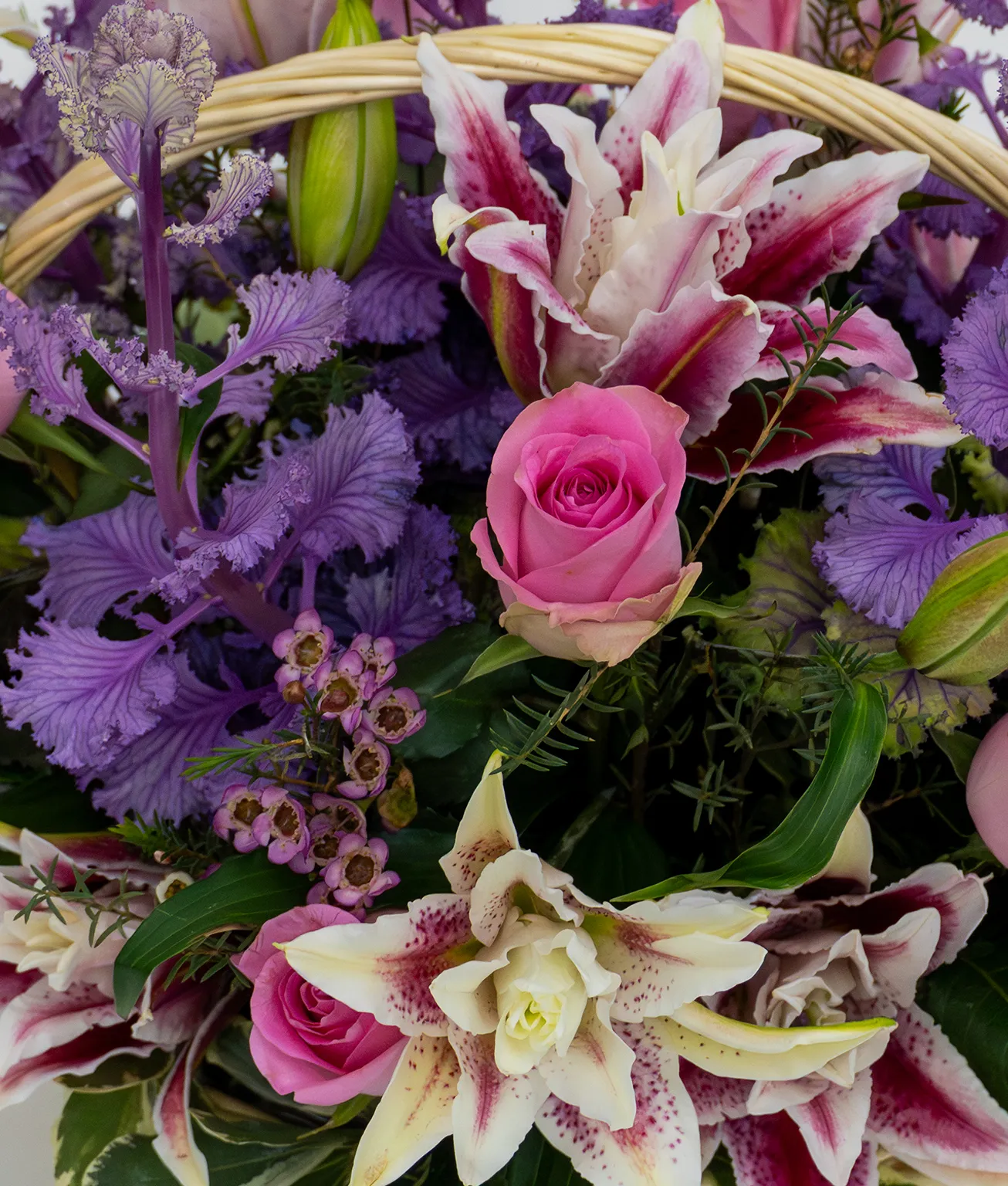The Abundance arrangement is a masterfully curated display that balances rustic charm with modern elegance. At its heart, the multi-layered Roselilies and classic Pink Roses provide a romantic, sophisticated fragrance, while the architectural Brassica adds an unexpected and trendy botanical edge. Dainty Wax Flowers and a full bunch of glossy Pittosporum create a lush, garden-fresh texture that fills the hand-woven basket to the brim.