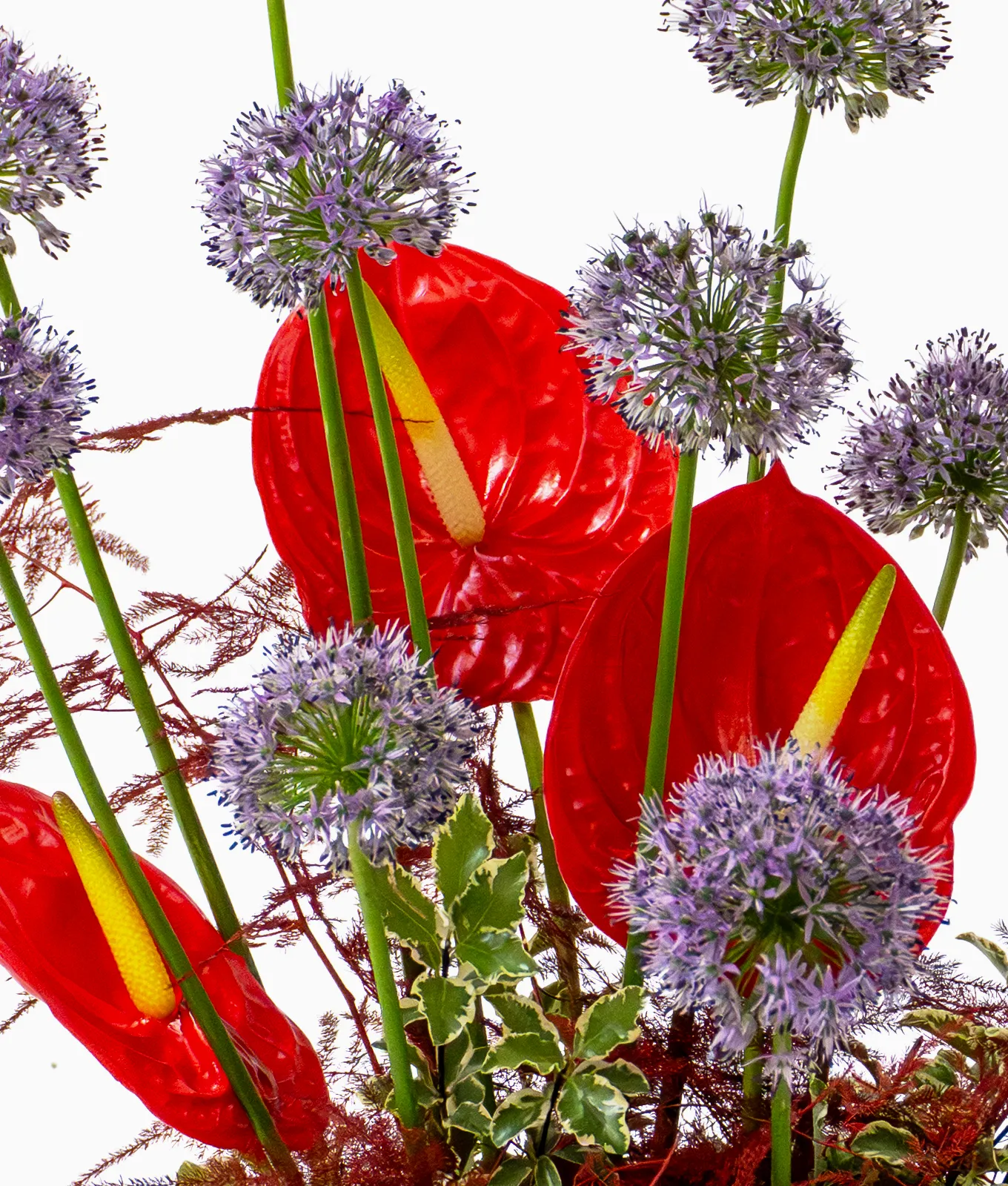 The beauty of Allium Affection lies in its striking verticality and the sophisticated balance of textures, all anchored by a sleek Alia Box. This contemporary arrangement is a masterclass in modern romance, featuring the architectural elegance of Purple Allium globes paired with the bold, heart-shaped allure of vibrant Red Anthuriums.