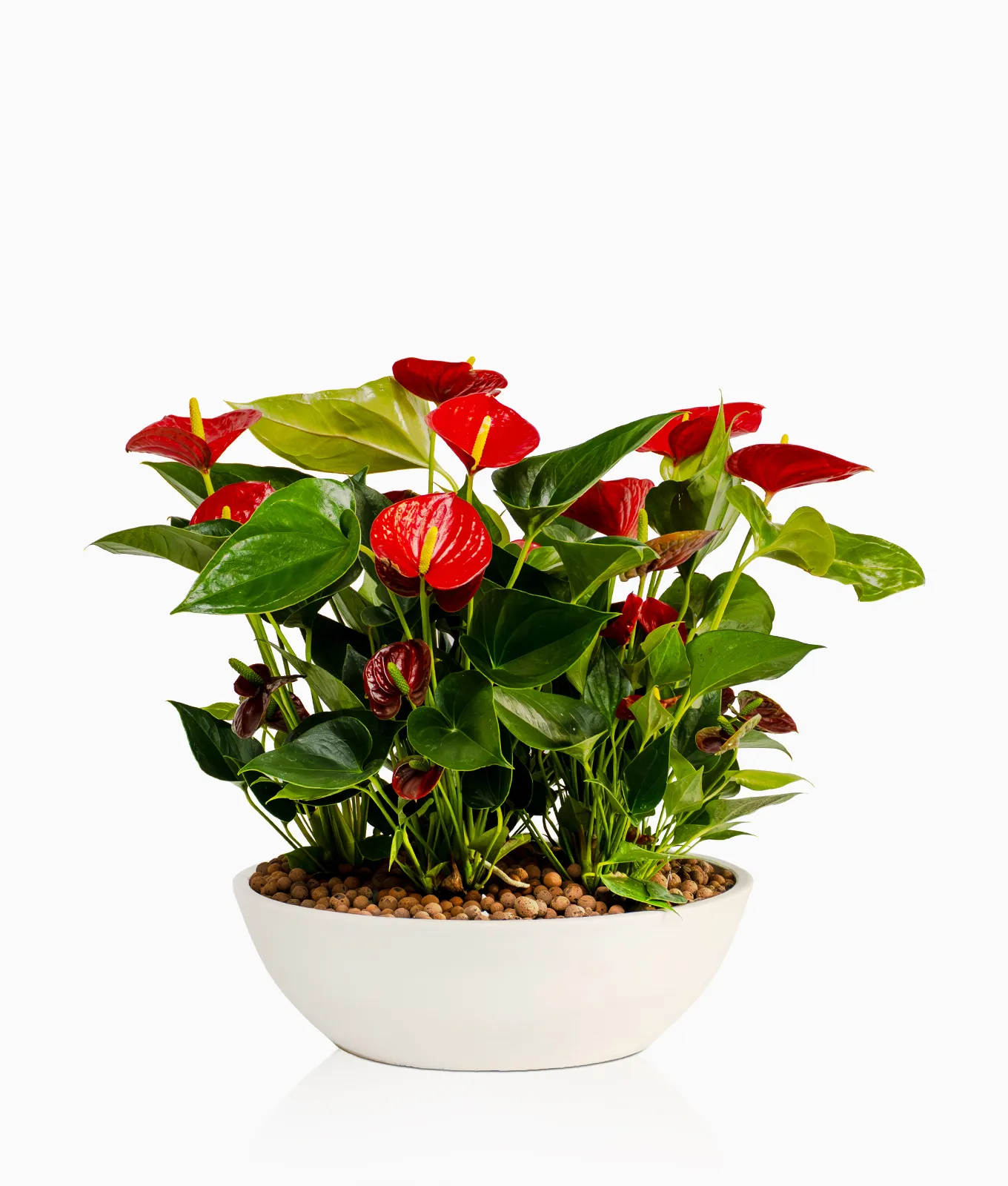 A Spell of Passion Captivate their heart with the spellbinding beauty of Anthurium Magic. This lush arrangement features the iconic, waxy red blooms of the Red Anthurium, symbolizing deep attraction and hospitality. Nestled in a contemporary fiber pot and finished with a soft layer of natural moss, it is a magical, living tribute to a love that is as vibrant as it is enduring.