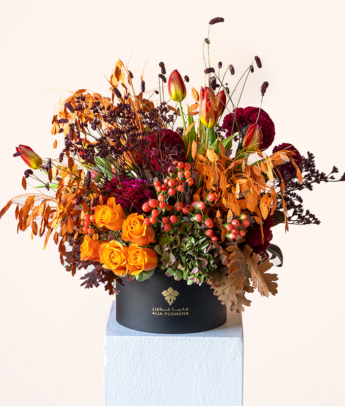 Beautifully arranged in a sophisticated hatbox, this piece radiates elegance and warmth, making it an ideal gift for any occasion or a charming accent for your home. Autumn Glow embodies the comfort, color, and joy that only the season can bring.