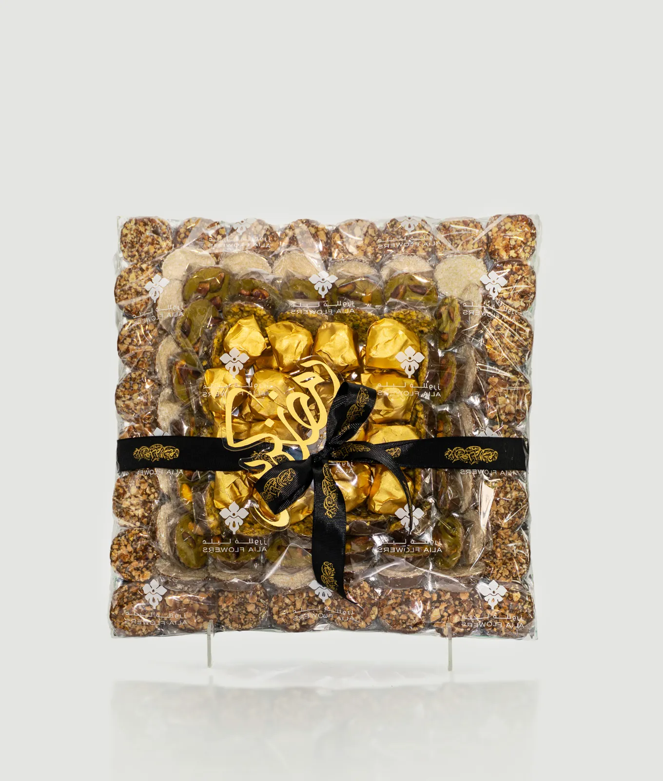 This curated selection features a harmonious blend of traditional textures and modern indulgence. Each piece is hand-selected to offer a journey of taste, from the crunch of premium roasted nuts to the velvety finish of artisanal chocolates and honey-kissed confections.