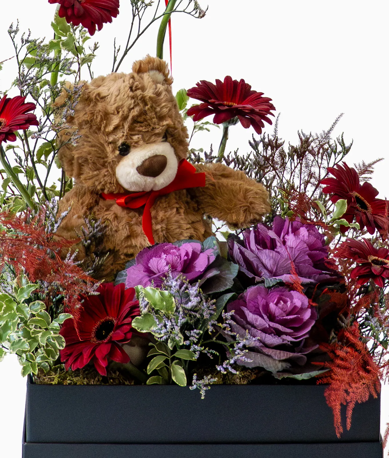 Beary Beloved is a whimsical and heartwarming gift set designed to deliver joy and affection in one stunning package. This playful arrangement features Dark Red Gerberas and unique Purple Brassica, creating a rich, autumnal-inspired palette.