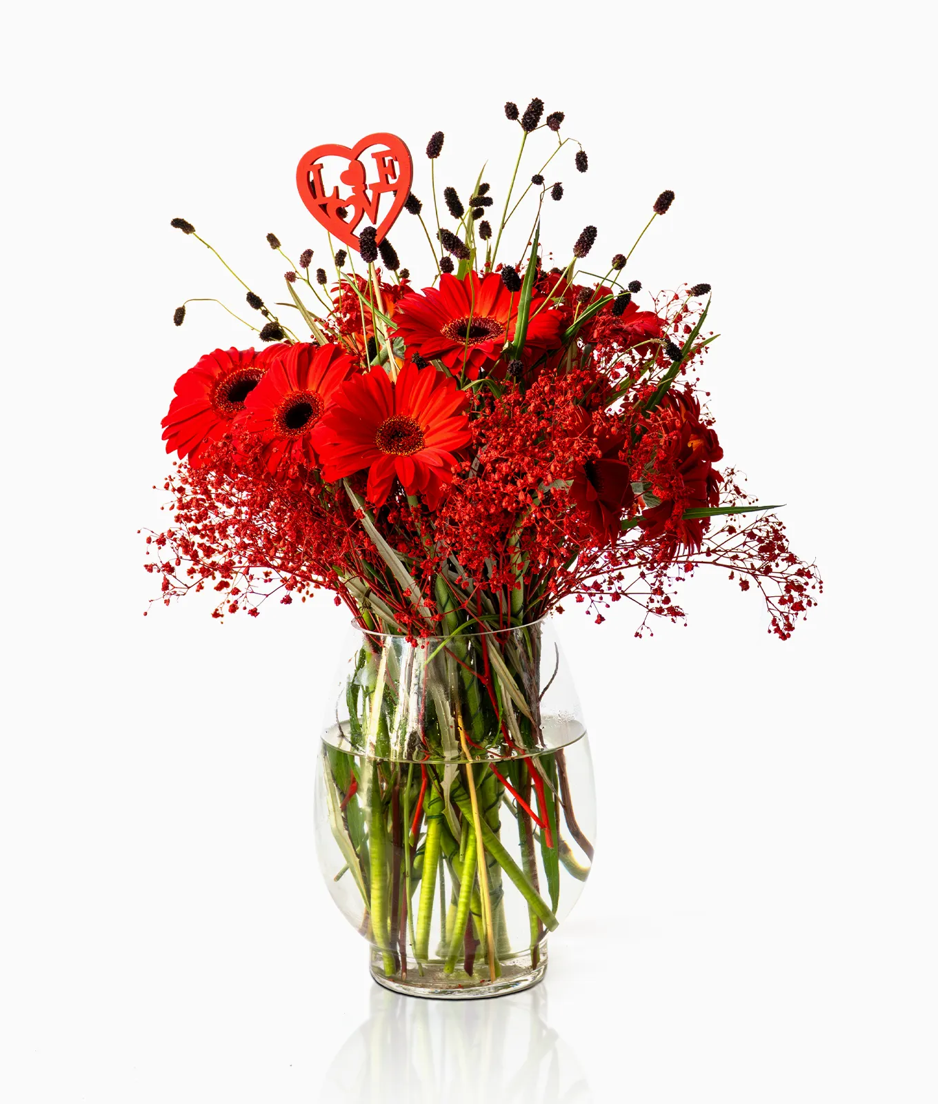 Set in a clear Glass Vase and topped with a Wooden Heart, it is a vibrant choice designed to bring warmth and sophisticated color to any space.