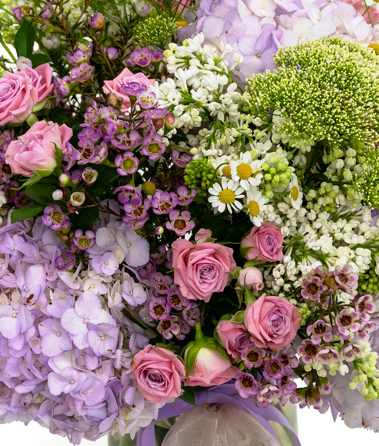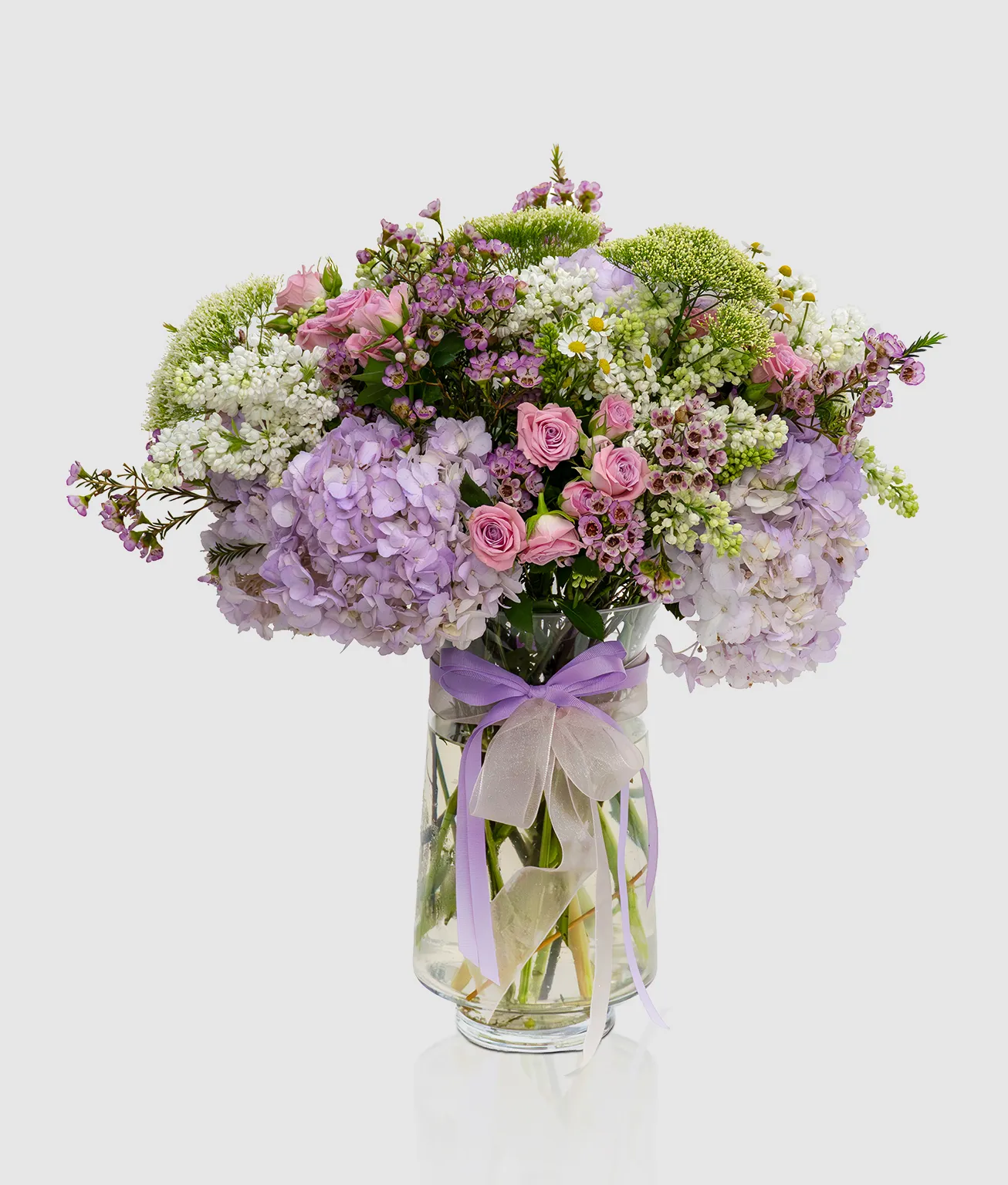 Blush Bloom is a delicate flower arrangement of light purple hydrangea, white syringa, and pink spray roses. Accented with yellow matricaria, purple wax flowers, and green trachelium, it radiates charm, elegance, and thoughtful beauty. Carefully arranged in a glass vase, it exudes sophistication and freshness. The combination of soft purples, pinks, and subtle yellows creates a serene and uplifting presence. A perfect way to convey admiration, appreciation, and heartfelt affection to someone meaningful.