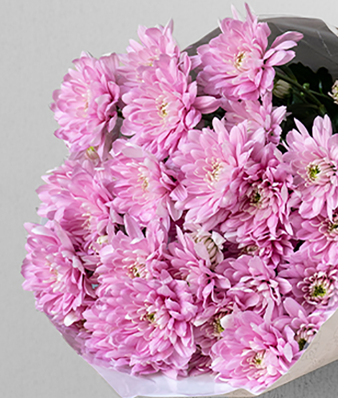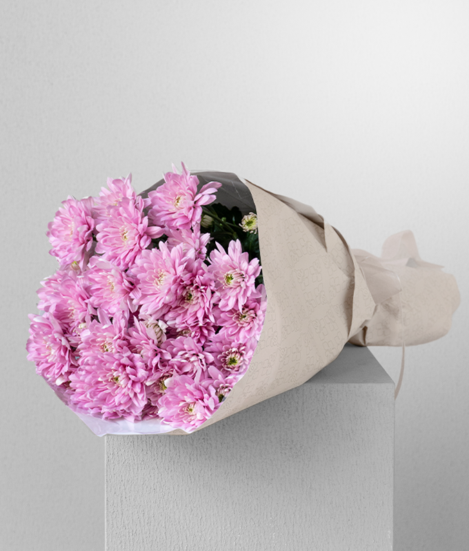 A soft and lush spray of pink chrysanthemums, carefully wrapped in neutral wrapping paper. This bouquet radiates serenity and delicate beauty.