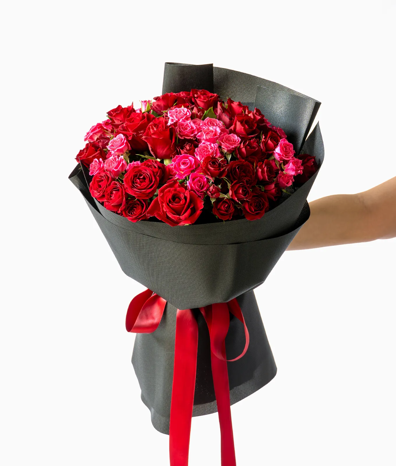 Blushing Ember is a sophisticated hand-tied bouquet featuring a passionate core of Red Roses layered with Red Spray Roses. The design is softened by Pink Spray Roses, creating a romantic, glowing gradient.