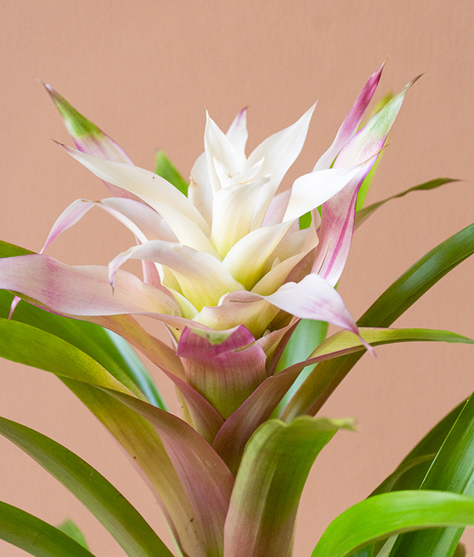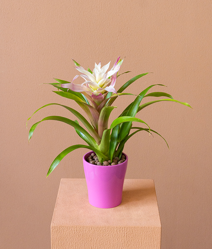 Botanic Bliss is a lush and vibrant arrangement featuring the bold Guzmania/Bromelia plant. Set in a soft pink ceramic pot, this delightful display brings a touch of love and serenity, making it the perfect gift or accent to brighten any room with its cheerful charm.