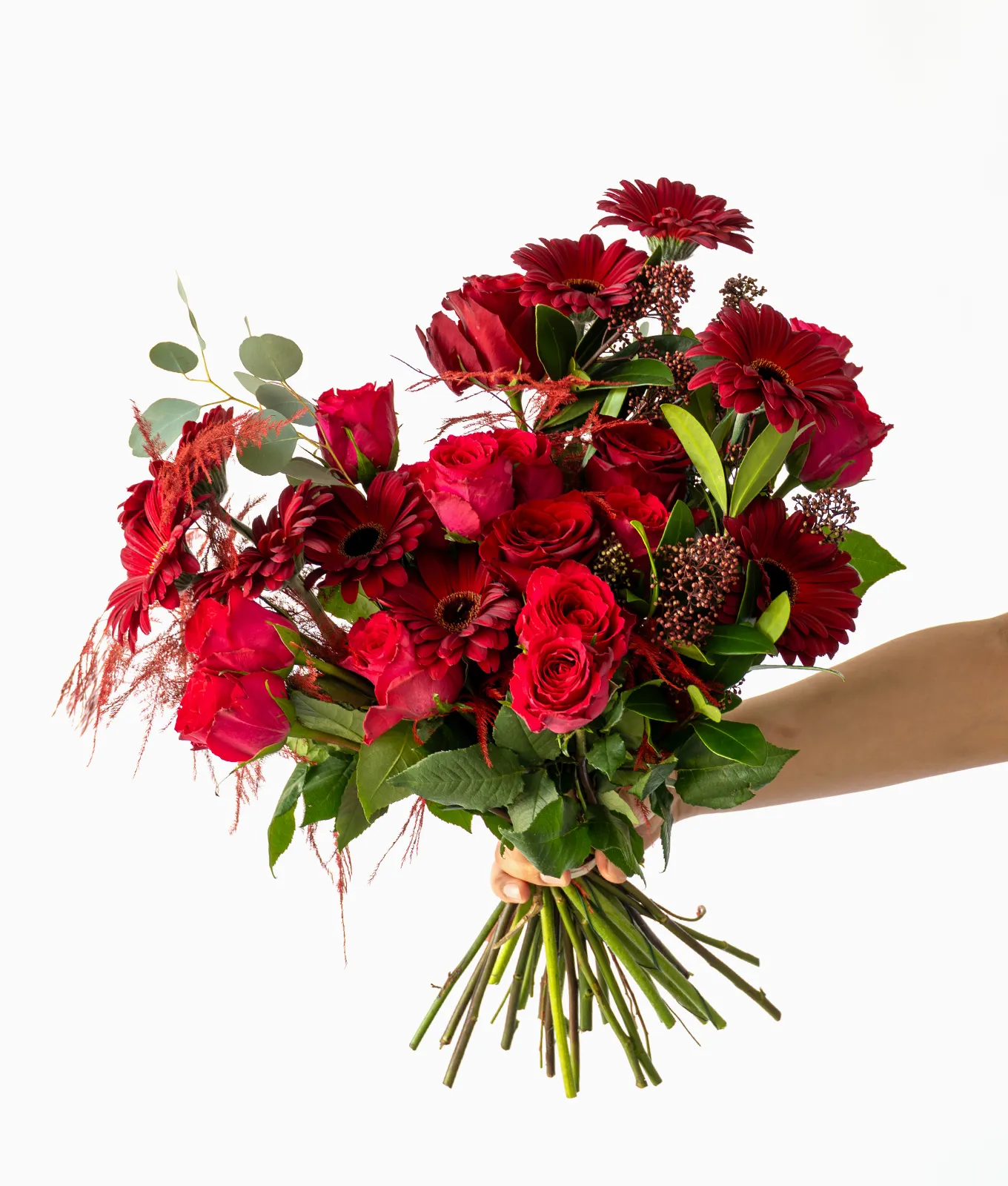 The design is artfully accented by stems of Red Skimmia and the feathery plumes of Red Asparagus, adding unique architectural depth. Finished with a touch of fresh Eucalyptus, this bouquet is a powerful expression of profound love and admiration.