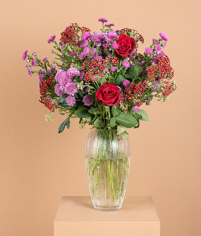 This arrangement features a mix of Red Roses, Chrysanthemums, Aster and Achillea.
