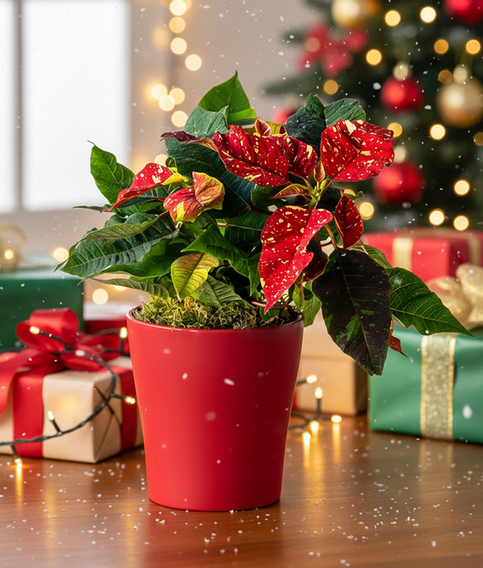 Bring a playful twist to holiday décor with Festive Star. This charming red poinsettia, adorned with delicate white spots, radiates cheer and festive spirit. Nestled in a vibrant red ceramic pot, it makes a striking statement full of color and personality.