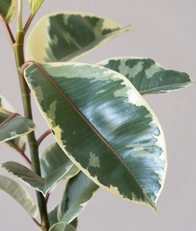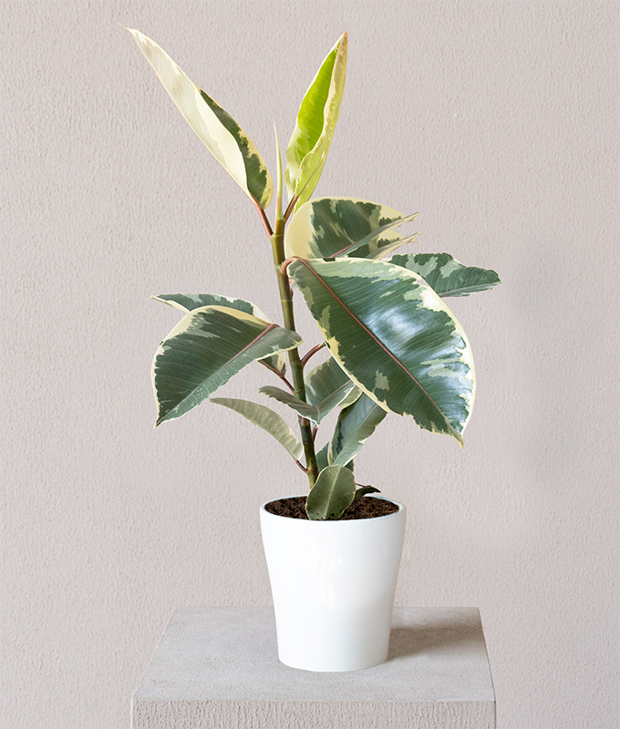 The Ficus Tineke, scientifically called Ficus elastica ‘Tineke’, features striking variegated leaves with shades of green, cream, and hints of pink. Its broad, glossy foliage adds a contemporary look to your décor. Planted in a sleek ceramic pot, it brings a fresh and vibrant vibe indoors.