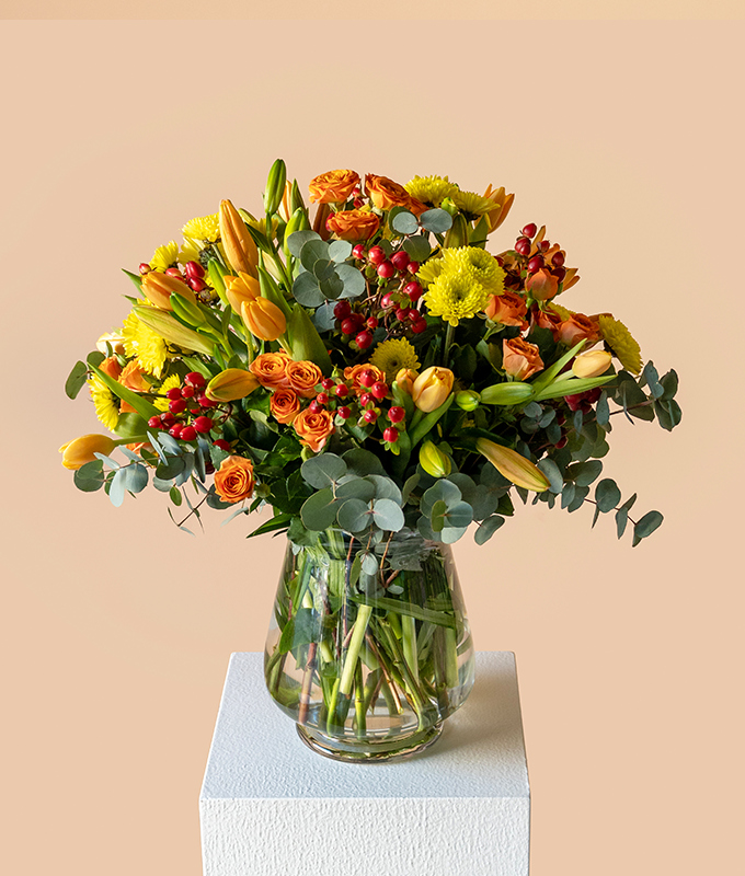 This arrangement features a mix of: Lilies, Sprayroses, Chrysanthemums, Tulips, Hypericums and Fillers.