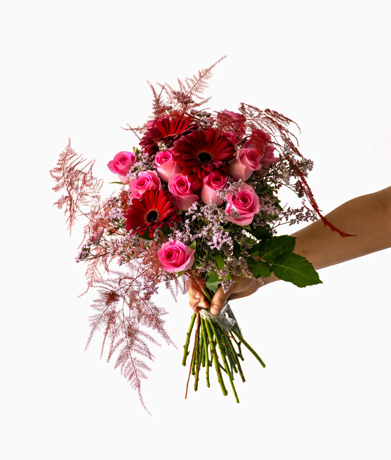 Floral Zephyr is an ethereal hand-tied bouquet that captures the light essence of a garden breeze. It features a graceful core of Pink Roses accented by Red Gerberas.