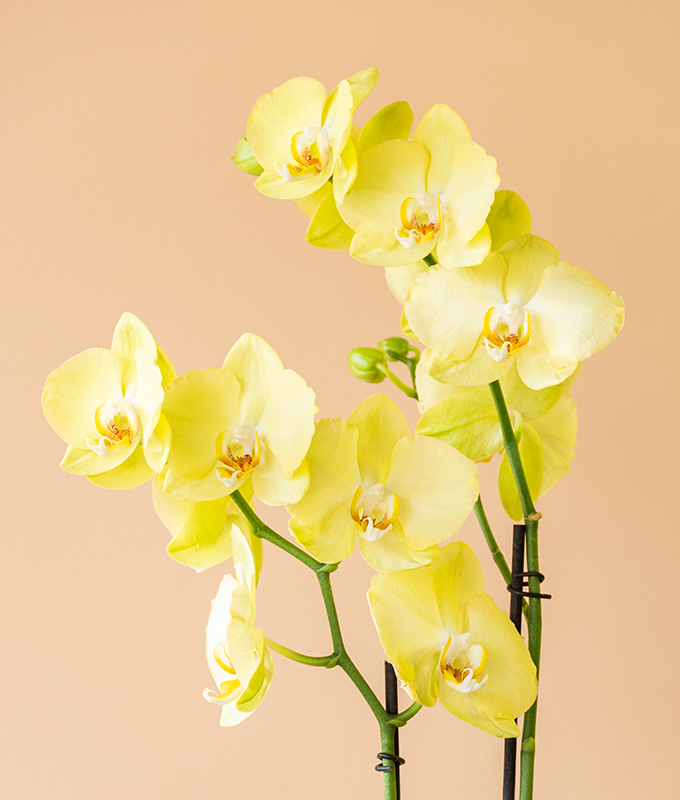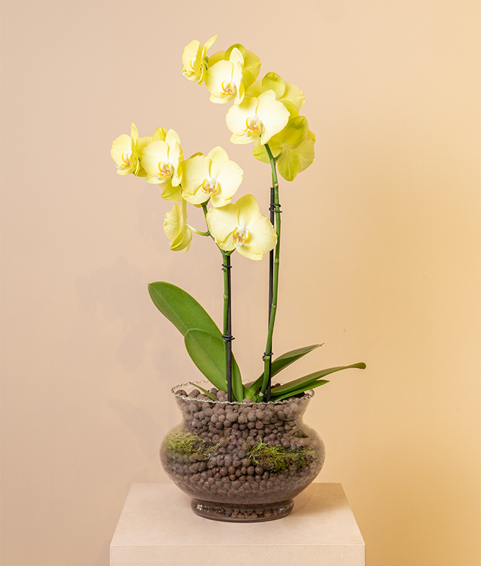 A vibrant Yellow Phalaenopsis orchid(Phalaenopsis amabilis) elegantly arranged in a clear glass vase.