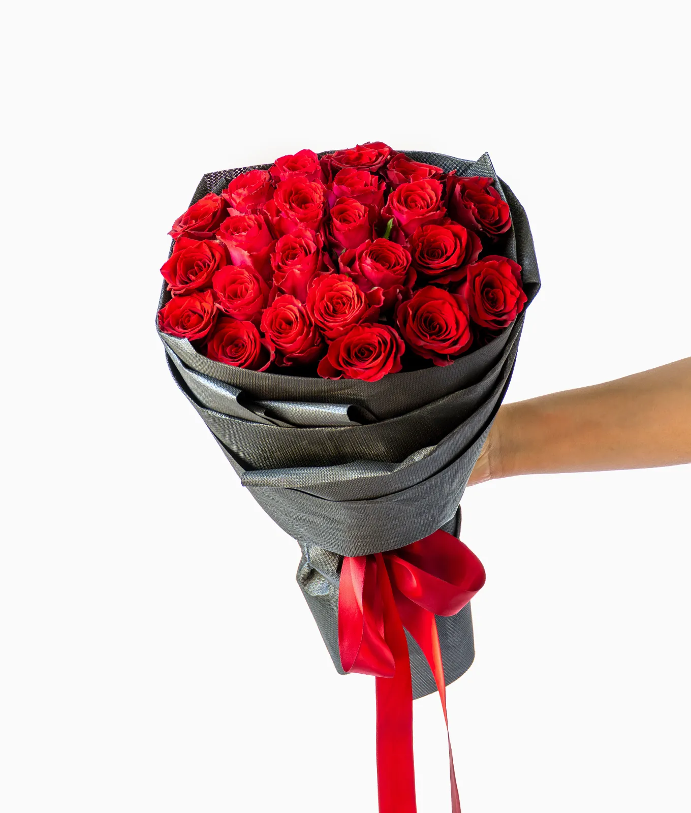 Grand Devotion is a breathtaking statement of classic romance, featuring 24 premium Red Roses. This magnificent hand-tied bouquet is encased in sleek black wrapping, providing a striking modern contrast to the deep crimson petals.