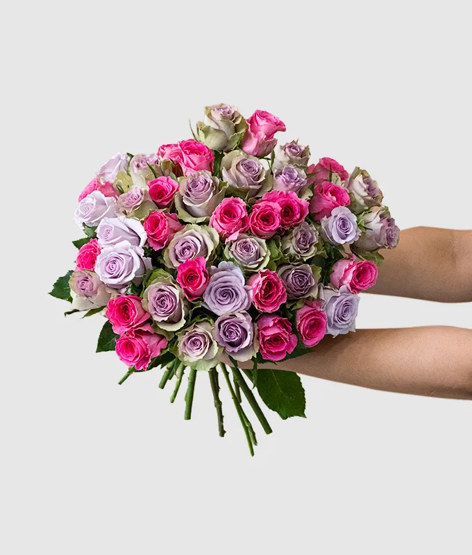 This bouquet features a mix of Pink Roses and Purple Roses.