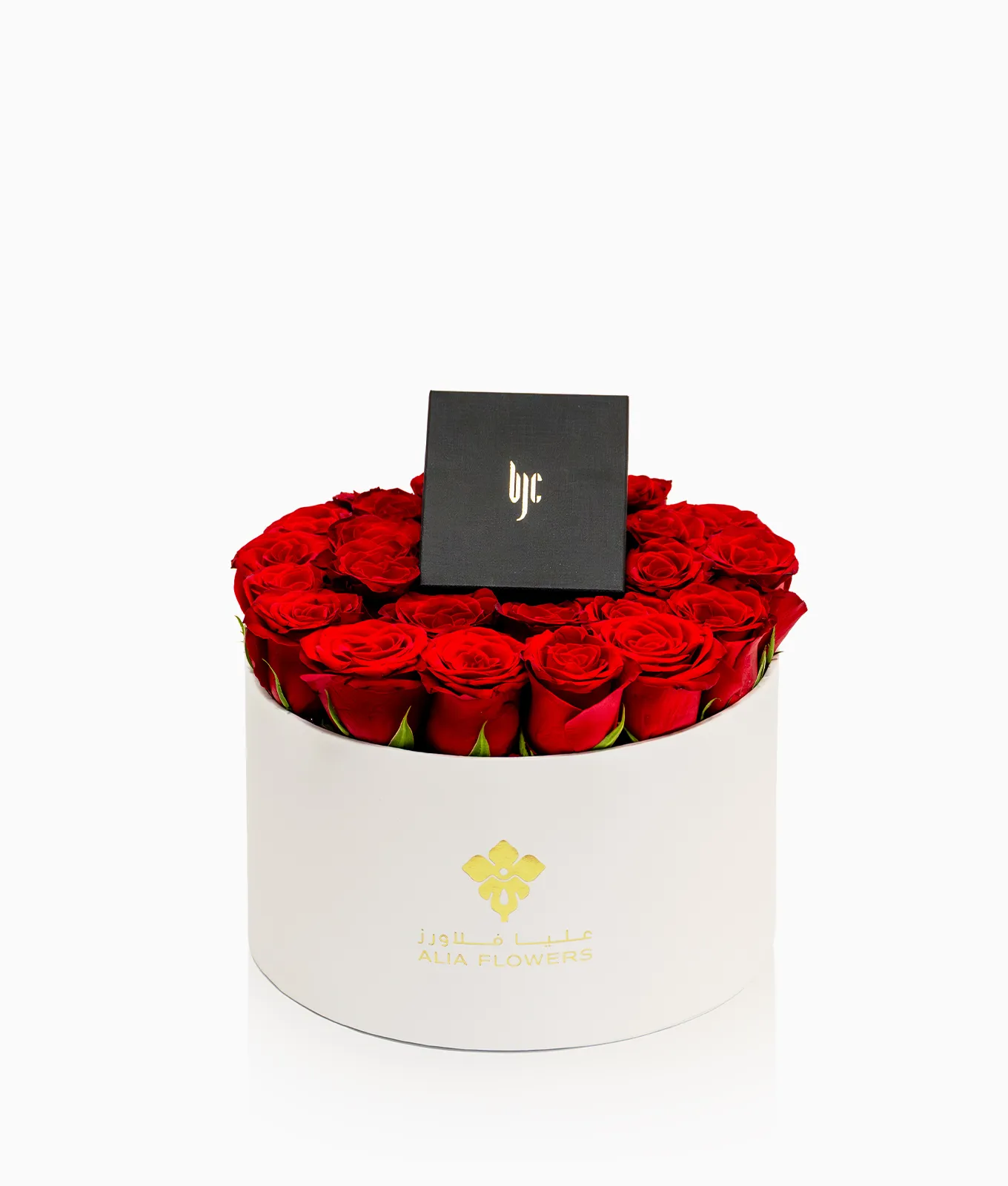 Unveil a masterpiece of romance with Habibi Rouge, a premier red rose box arrangement designed for an unforgettable reveal. This sophisticated display features 23 premium red roses hand-arranged in a signature white décor box. Hidden at the heart of the velvety crimson petals is an exclusive jewelry chain from Bahrain Jewellery Centre (BJC), transforming a beautiful floral gift into a prestigious, lasting keepsake. It is the ultimate choice for a luxury Valentine’s Day proposal or a high-end anniversary surprise featuring Bahrain’s finest craftsmanship.