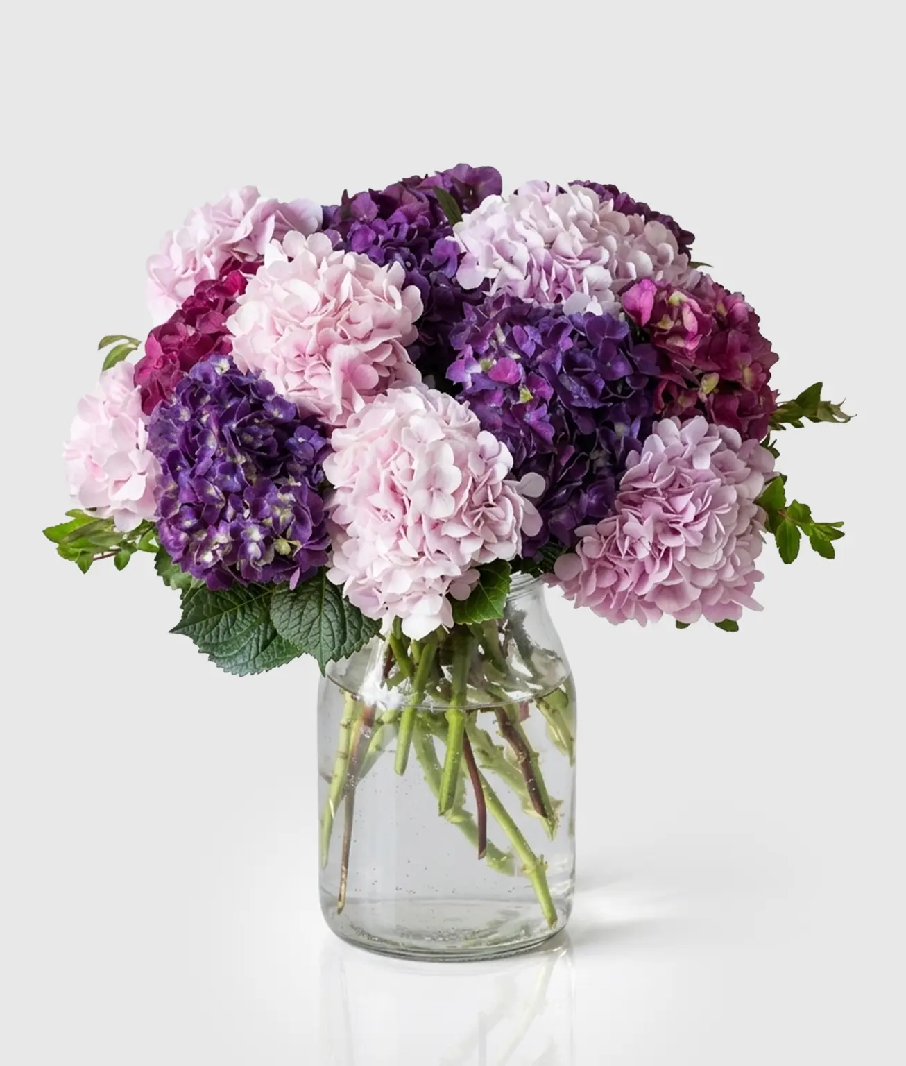 This arrangement features a mix of Pink Hydrangeas, Purple Hydrangeas and Green Vaccinium Leaf.