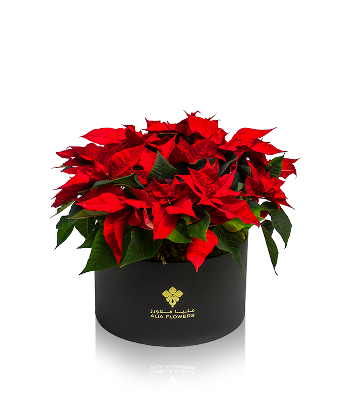 Bring the warmth and wonder of the season into any space with Holiday Magic. This striking arrangement features vibrant red poinsettia plants—Christmas’s most iconic bloom—beautifully presented in our signature black Alia Flowers hat box.