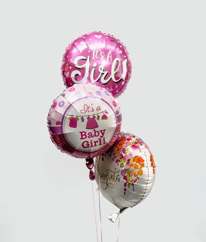A bouquet of 3 delightful balloons to celebrate the arrival of your baby girl.