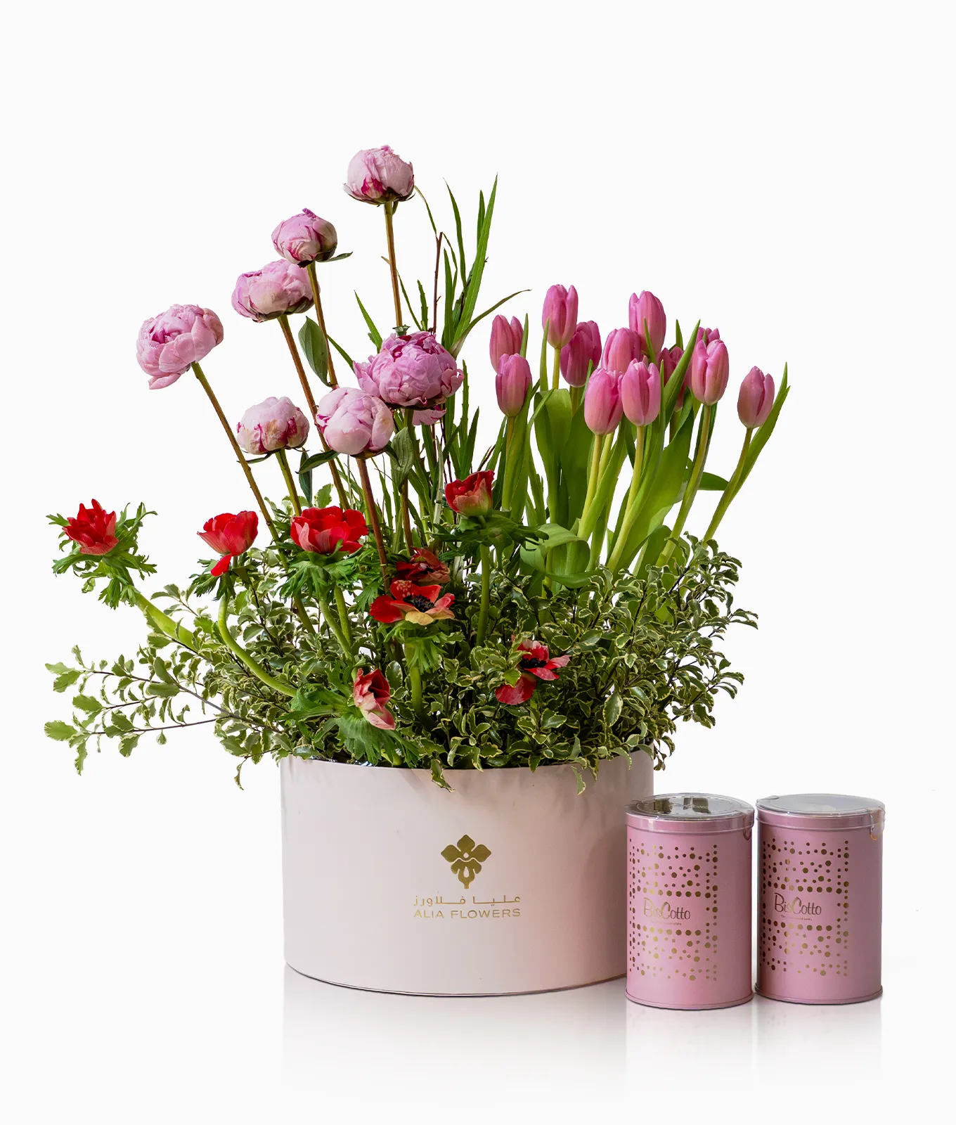 L’Amour Croquant is a vibrant and enchanting garden-style arrangement that celebrates the romance of spring through a diverse palette of textures and tones. This luxurious display features Pink Peonies and Pink Tulips, balanced by the bold, striking contrast of Red Anemones.