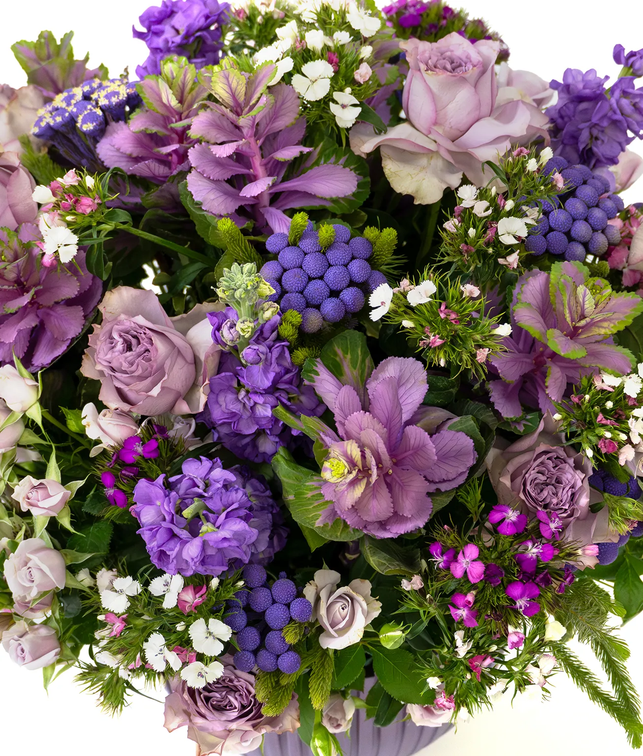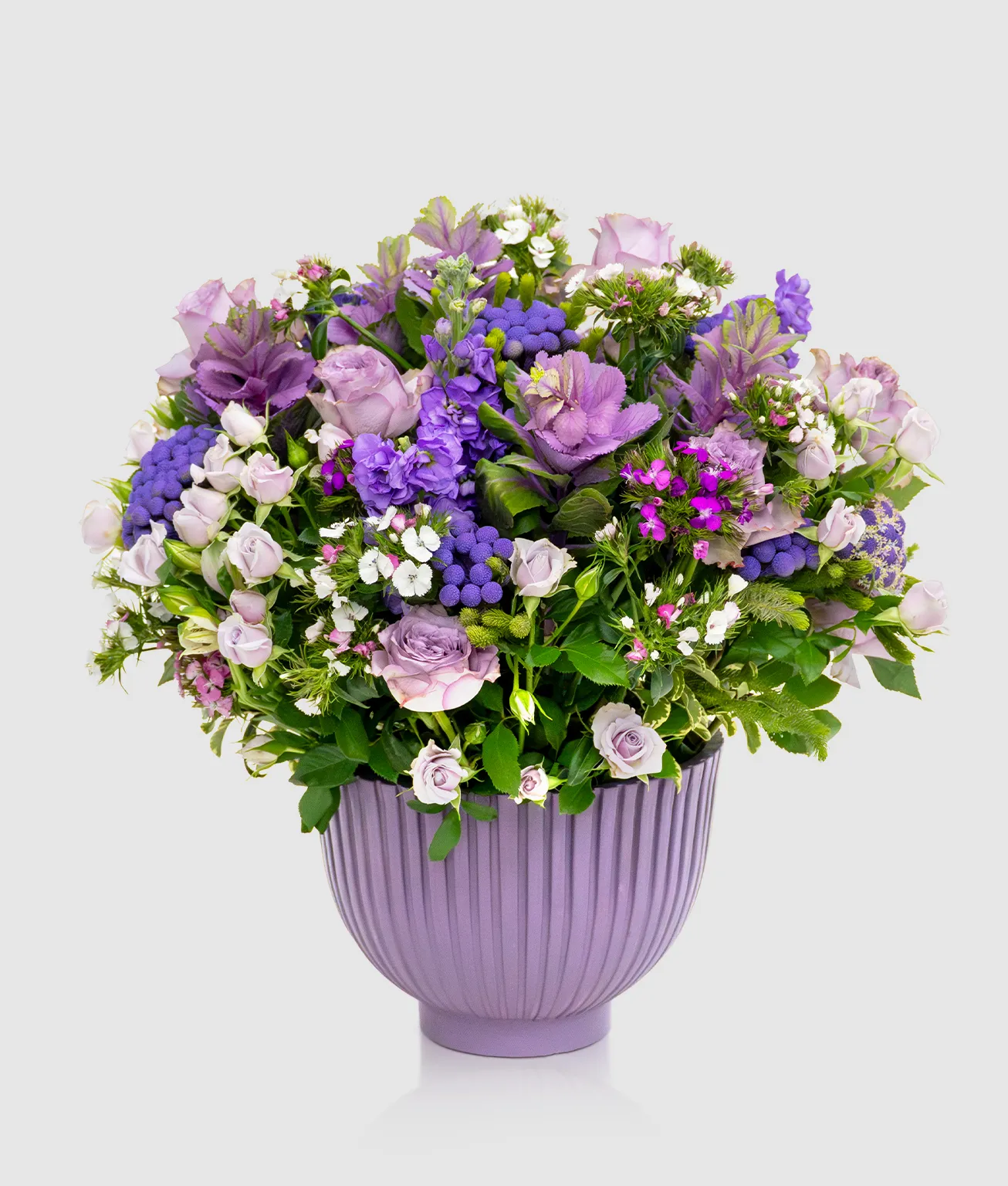 Lavender Luxe is a luxurious flower arrangement of purple roses, purple brunia, and purple brassica. Accented with dianthus, purple spray roses, purple matthiola, and lush pittosporum, it radiates elegance and heartfelt affection. Carefully arranged in a fiber pot, it exudes charm and sophistication. Its mix of purples and soft hues creates a graceful, uplifting presence. A beautiful way to show someone they are cherished and truly special.