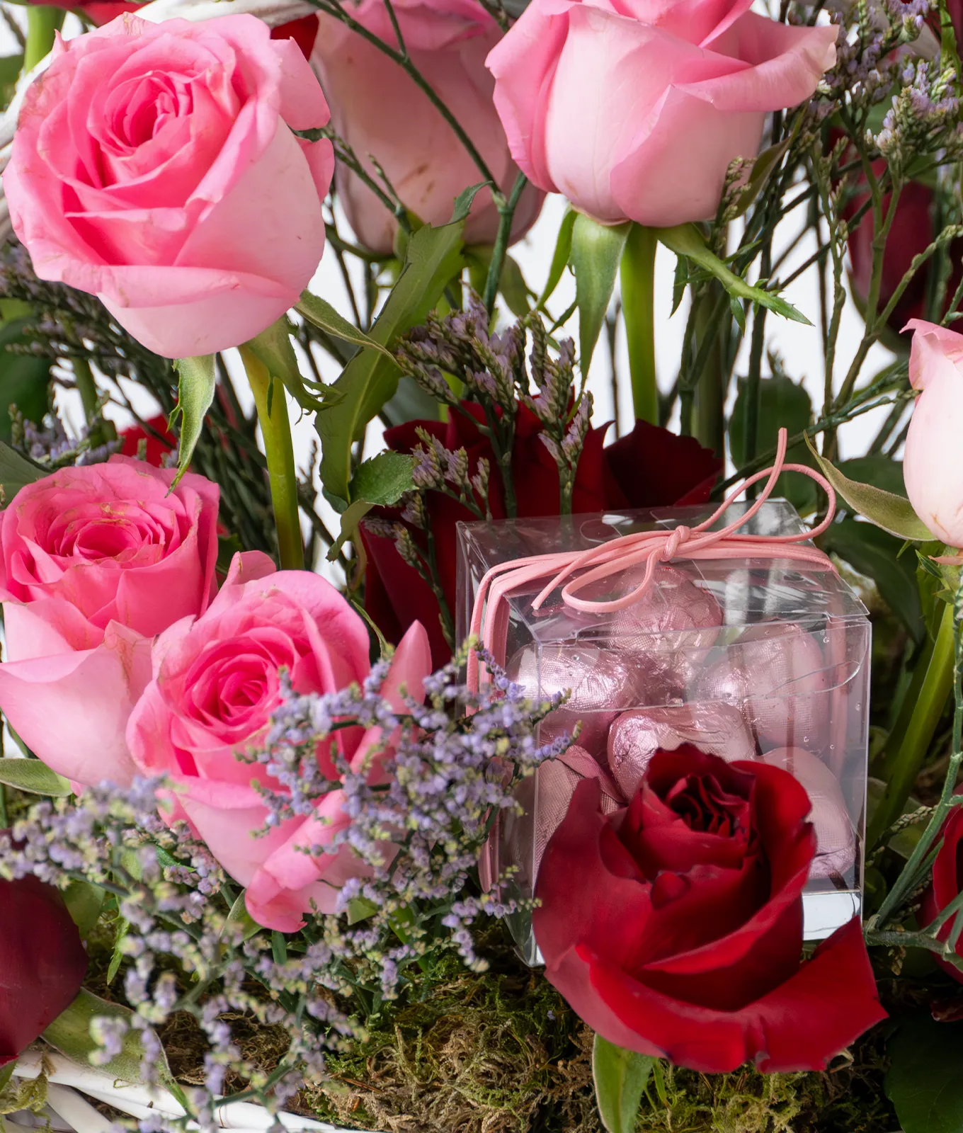 Love Aura is a charming and radiant display that balances romantic tones with a soft, natural aesthetic. This arrangement features a lush blend of Red Roses and Pink Roses, creating a vibrant and tiered palette of color.