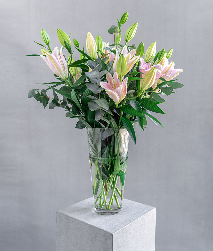 A lovely and beautiful arrangement of light pink blooms in a classic glass vase.