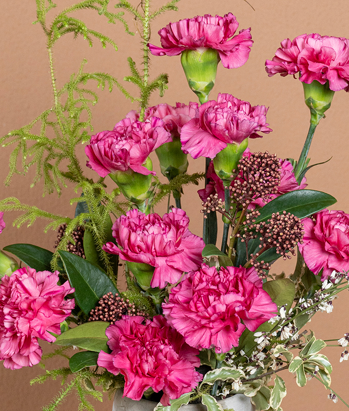 This arrangement features a mix of Pink Carnations, Skimmia Stem, Staghorn Club Stem, Moss, Genista, Pink Heart Topper.