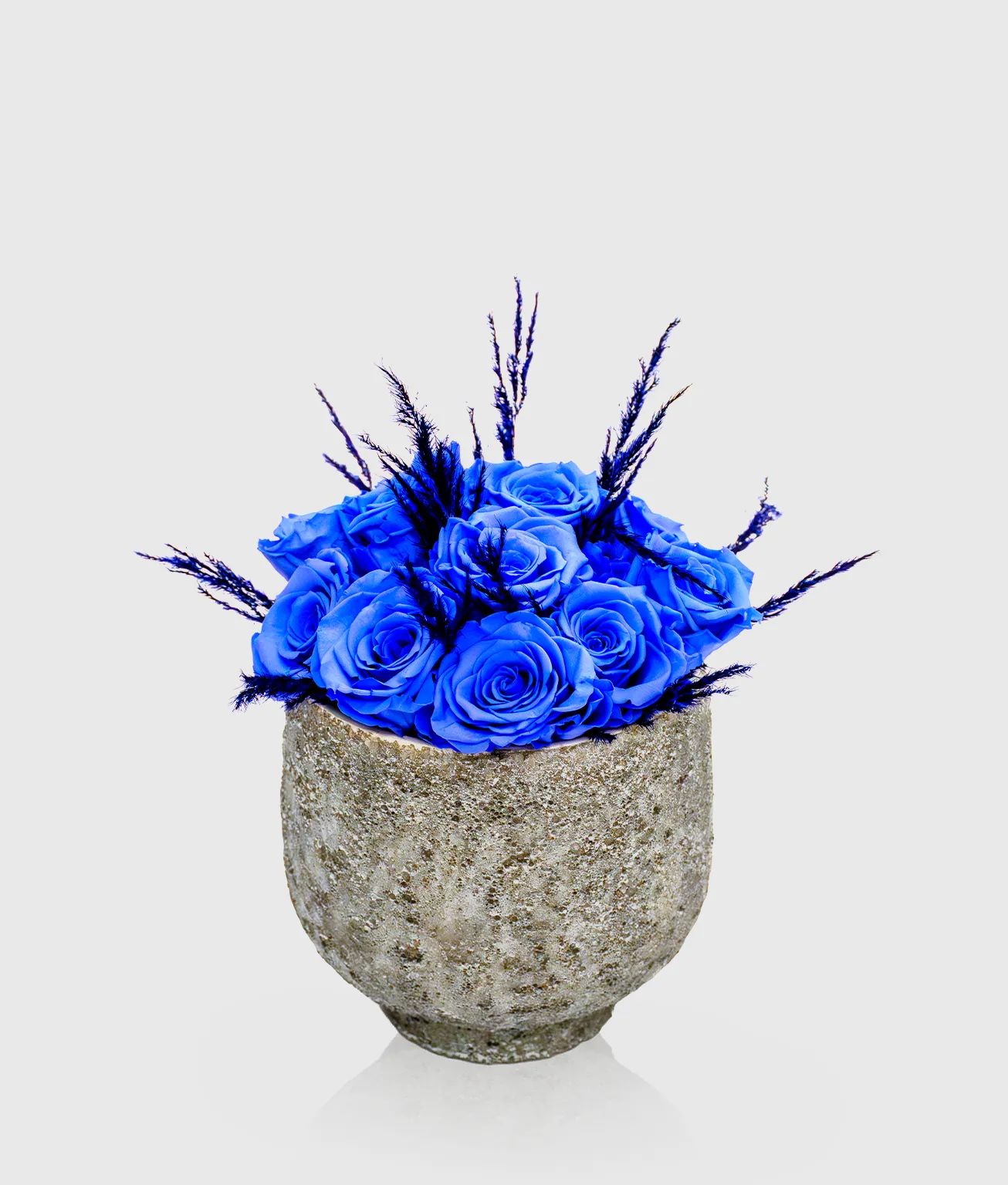 A bold and architectural artificial flower piece featuring a lush, concentrated base of deep violet roses accented by a striking burst of dark, feathered botanical sprigs. This dramatic composition stands as an enduring tribute to a legacy of wisdom and quiet strength, offering a sophisticated beauty that never fades.