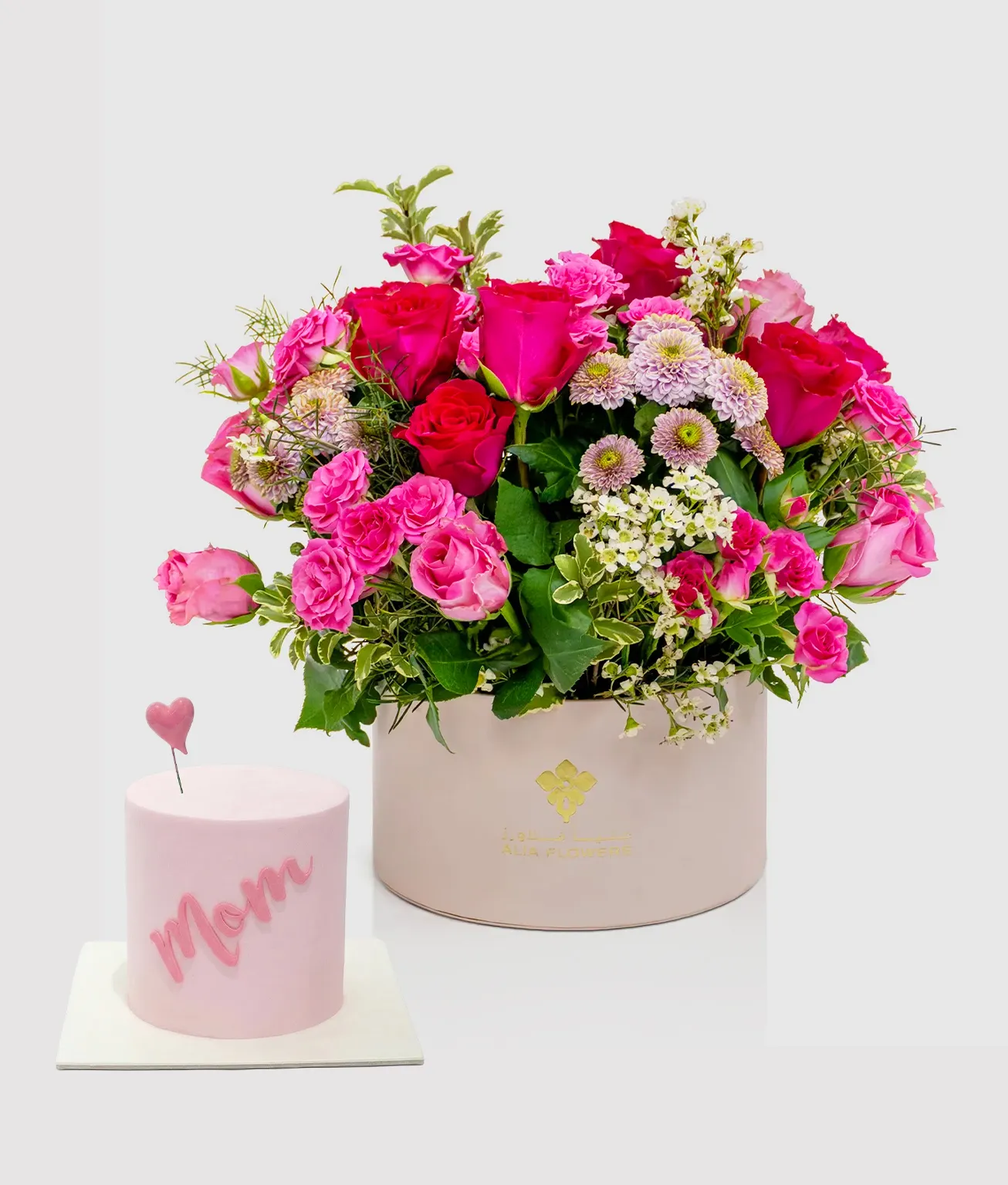 An elegant flower arrangement of pink and dark pink roses, purple chrysanthemums, and spray roses, beautifully presented in our stylish signature Alia box. This heartfelt set is paired with a delicious 1 kg chocolate moist cake with rich chocolate cream and a satisfying crunchy layer.