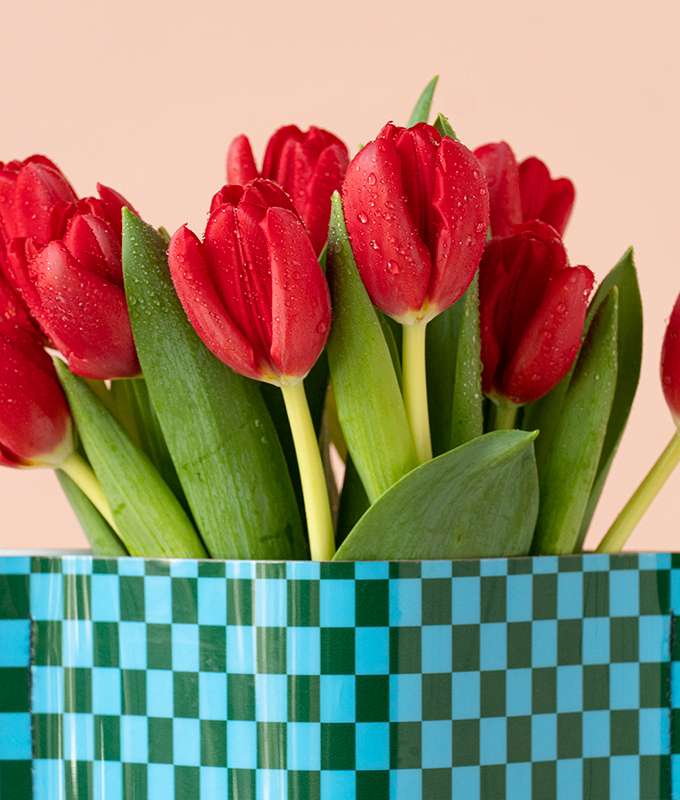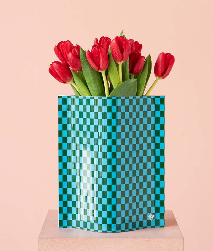 Radiant red tulips bloom vibrantly in a striking Blue and Green Checkered Alia Flowers paper vase with a cylindrical glass vase inside. A bold centerpiece to uplift any occasion.