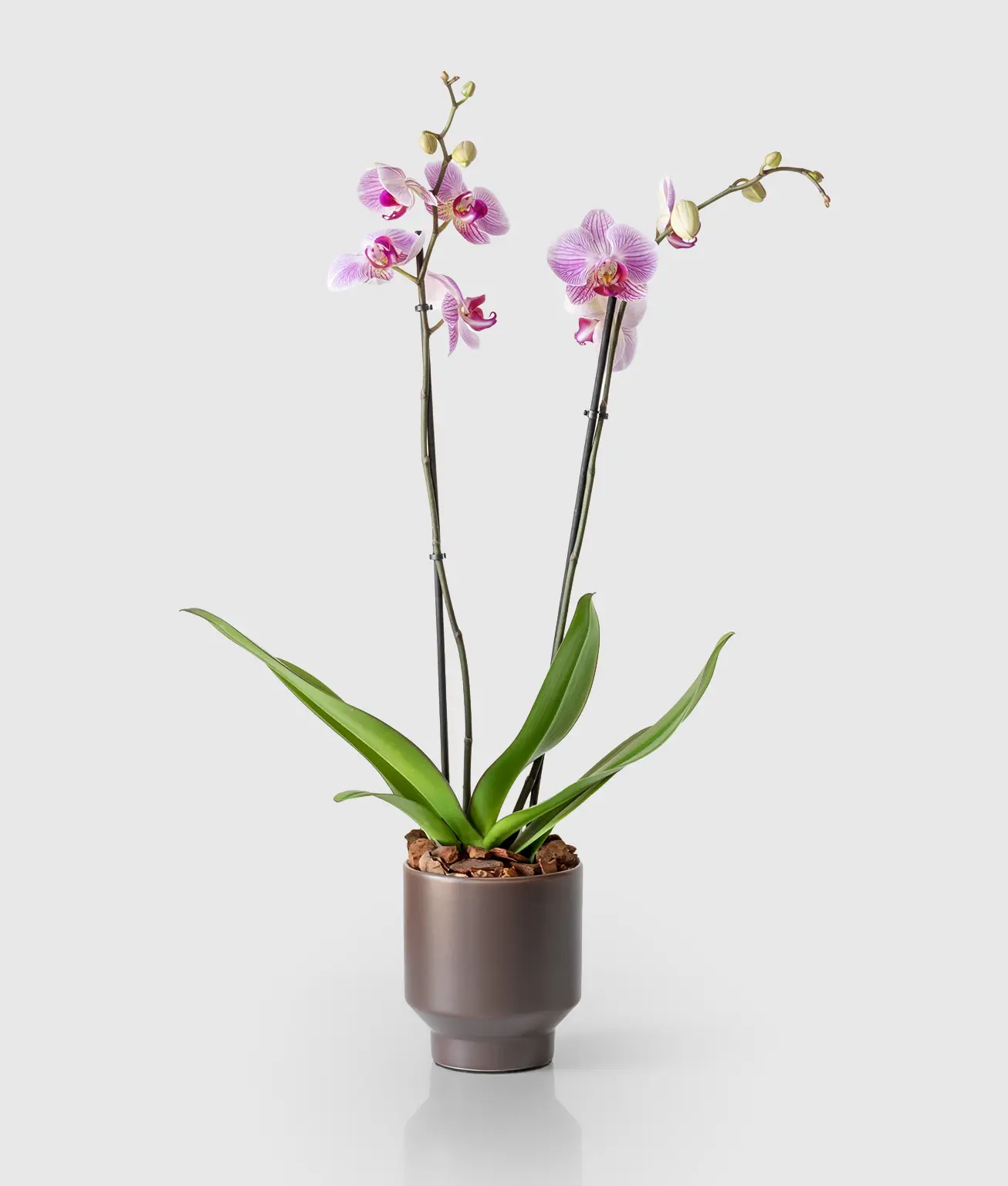 A captivating display of natural elegance. This graceful Pink Phalaenopsis orchid, presented in a refined brown ceramic pot, blends soft, romantic blooms with earthy sophistication. Its delicate petals in gentle blush hues stand out beautifully against the warm tones of the pot, creating a striking harmony of color and form. Whether adorning your home, office, or given as a thoughtful gift, Orchid Allure embodies timeless beauty, refined style, and a touch of serene luxury.