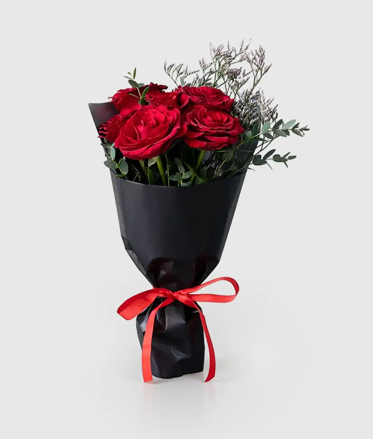 A simple yet elegant arrangement of six fresh red roses, accented with delicate fillers. Wrapped in black wrapping paper, “Scarlet Serenade” is a thoughtful gift for any occasion.