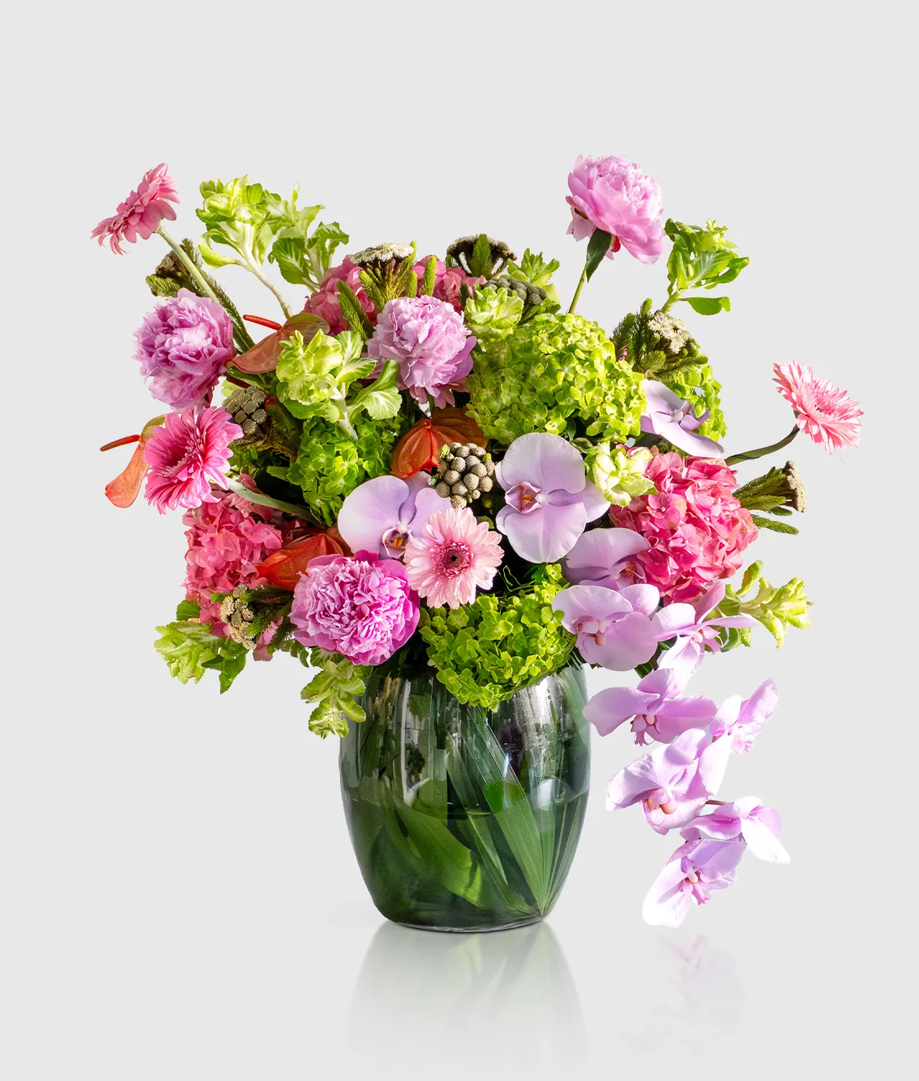 Soft pinks meet refreshing greens in this sophisticated interplay of exotic and classic blooms. From the waxy sheen of small pink anthuriums to the unique, silver-toned brunia berries, every element is hand-selected to create a vibrant, high-fashion floral statement.