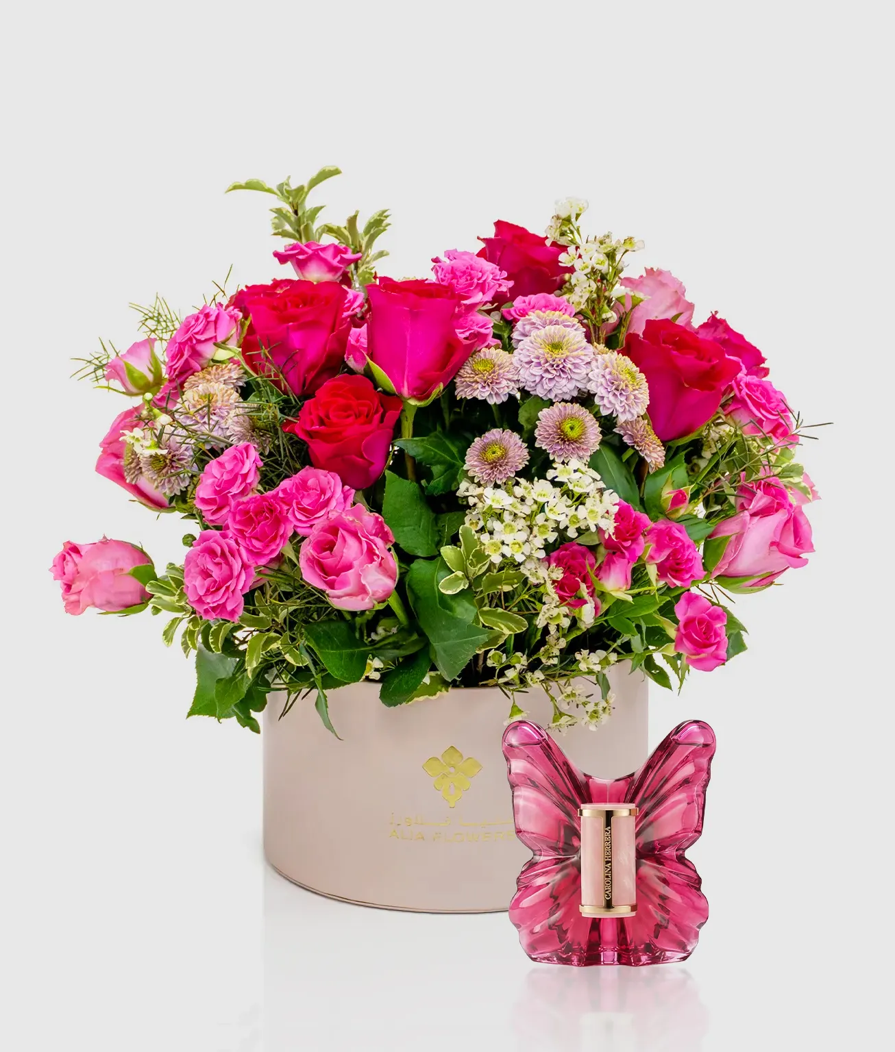 A vibrant flower arrangement of pink and dark pink roses, purple chrysanthemum buttons, and delicate spray roses, beautifully presented in a stylish Pink Round Alia box. This striking set is paired with the bold and feminine Carolina Herrera CH La Bomba (Pasión) EDP 80ml.