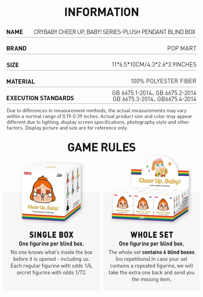 Crying Again Series Plush Pendant Blind Box: The blind box contains a random figure from a specific series. Each blind box only contains one figure. No one, including us, knows what’s inside.
