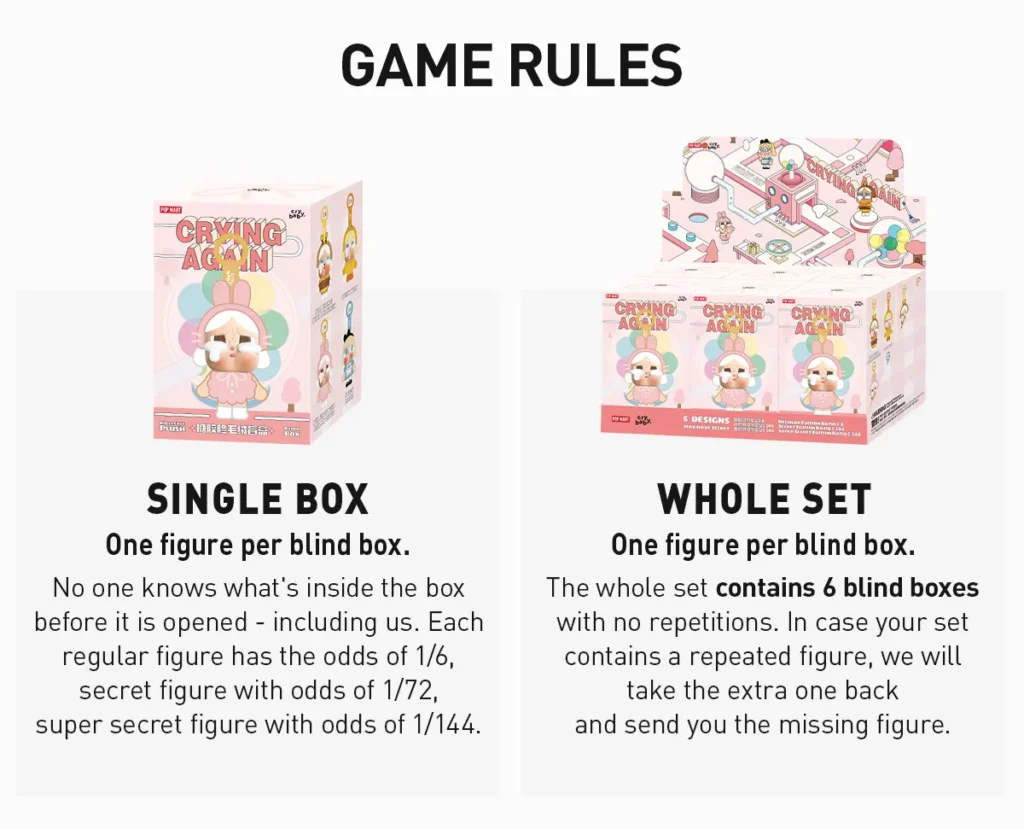 Crying Again Series Plush Pendant Blind Box: The blind box contains a random figure from a specific series. Each blind box only contains one figure. No one, including us, knows what’s inside.