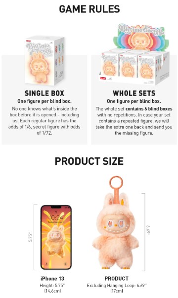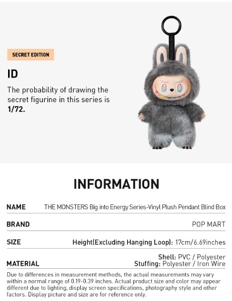 Big Into Energy Plush Pendant Blind Box: The blind box contains a random figure from a specific series. Each blind box only contains one figure. No one, including us, knows what’s inside.