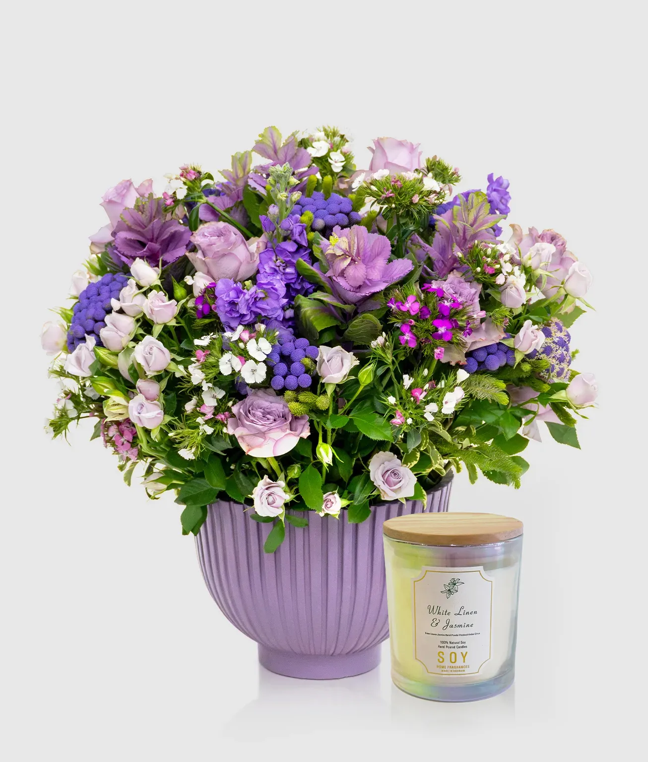 An elegant flower arrangement of purple matthiola, roses, and unique purple brassica, beautifully presented in a textured lavender fiber pot. This calming set is paired with a premium, aromatic Soy Jasmine Candle to create a serene and fragrant atmosphere.