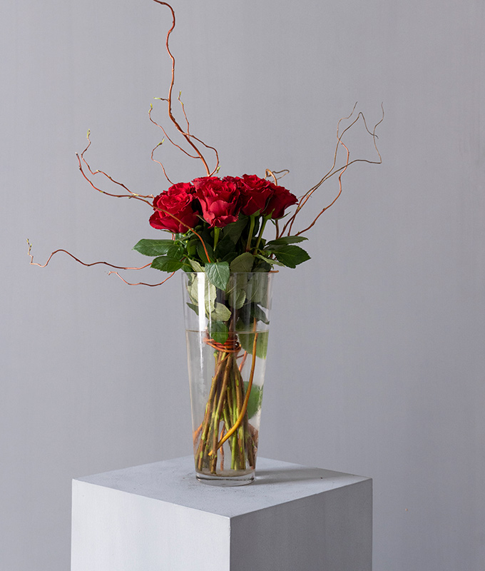 A tall arrangement of premium red roses in a clear glass vase, accented with delicate willow branches. A timeless display of love and sophistication.