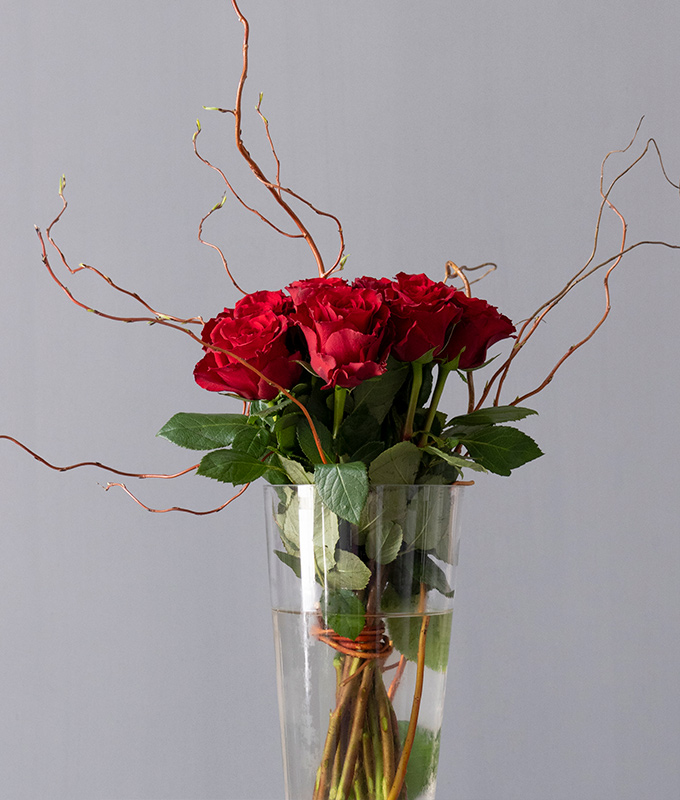 A tall arrangement of premium red roses in a clear glass vase, accented with delicate curly willow branches. A timeless display of love and sophistication.