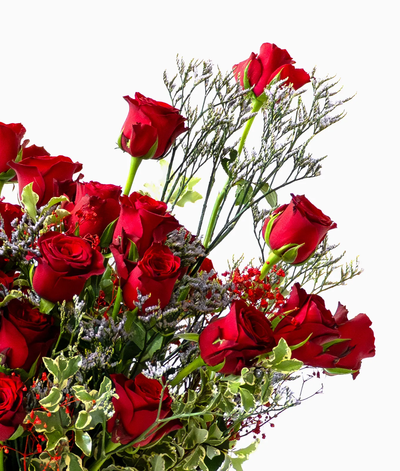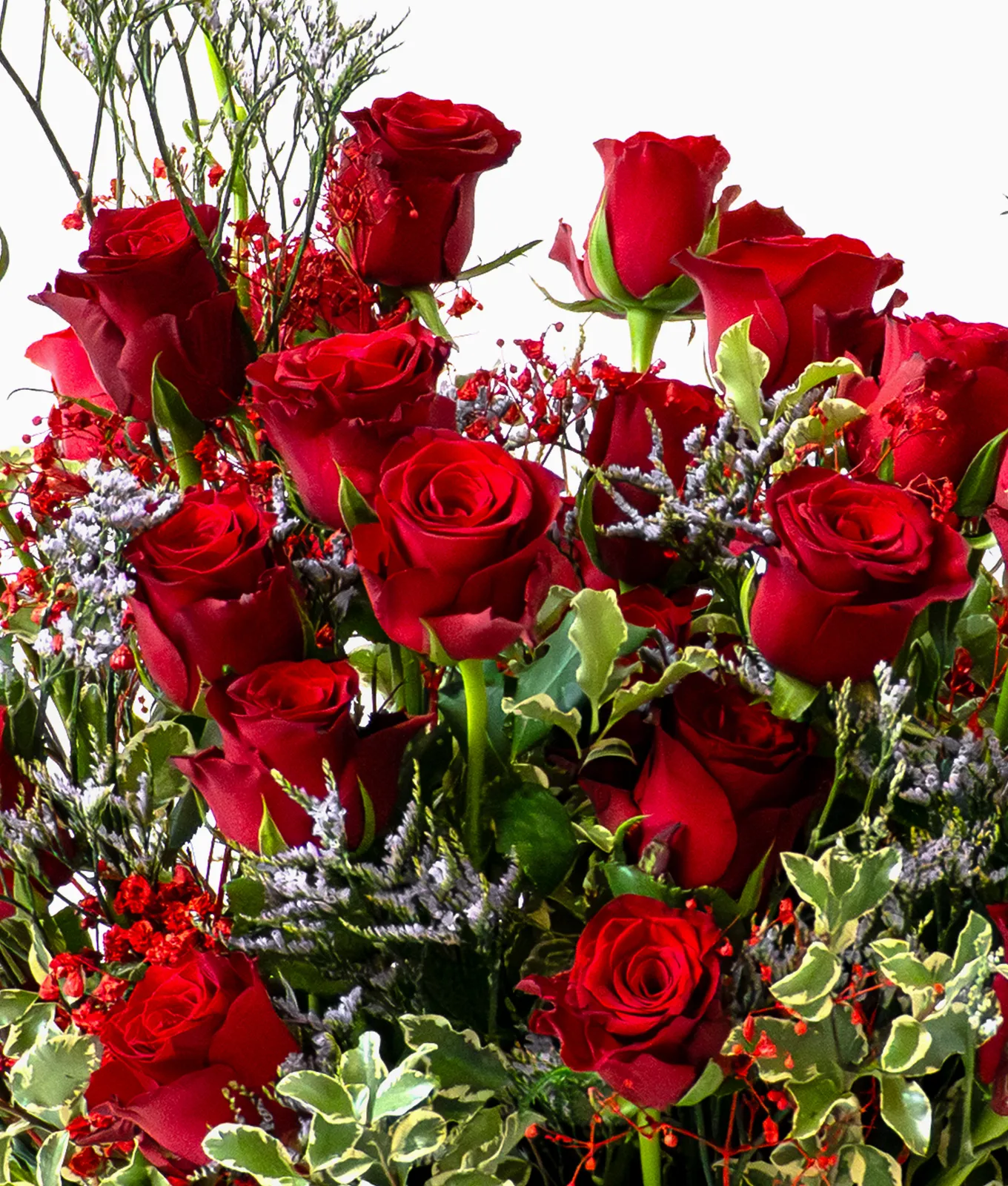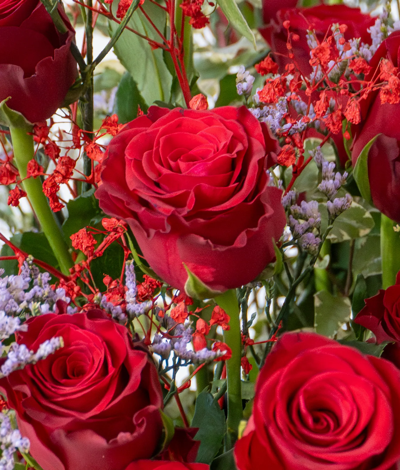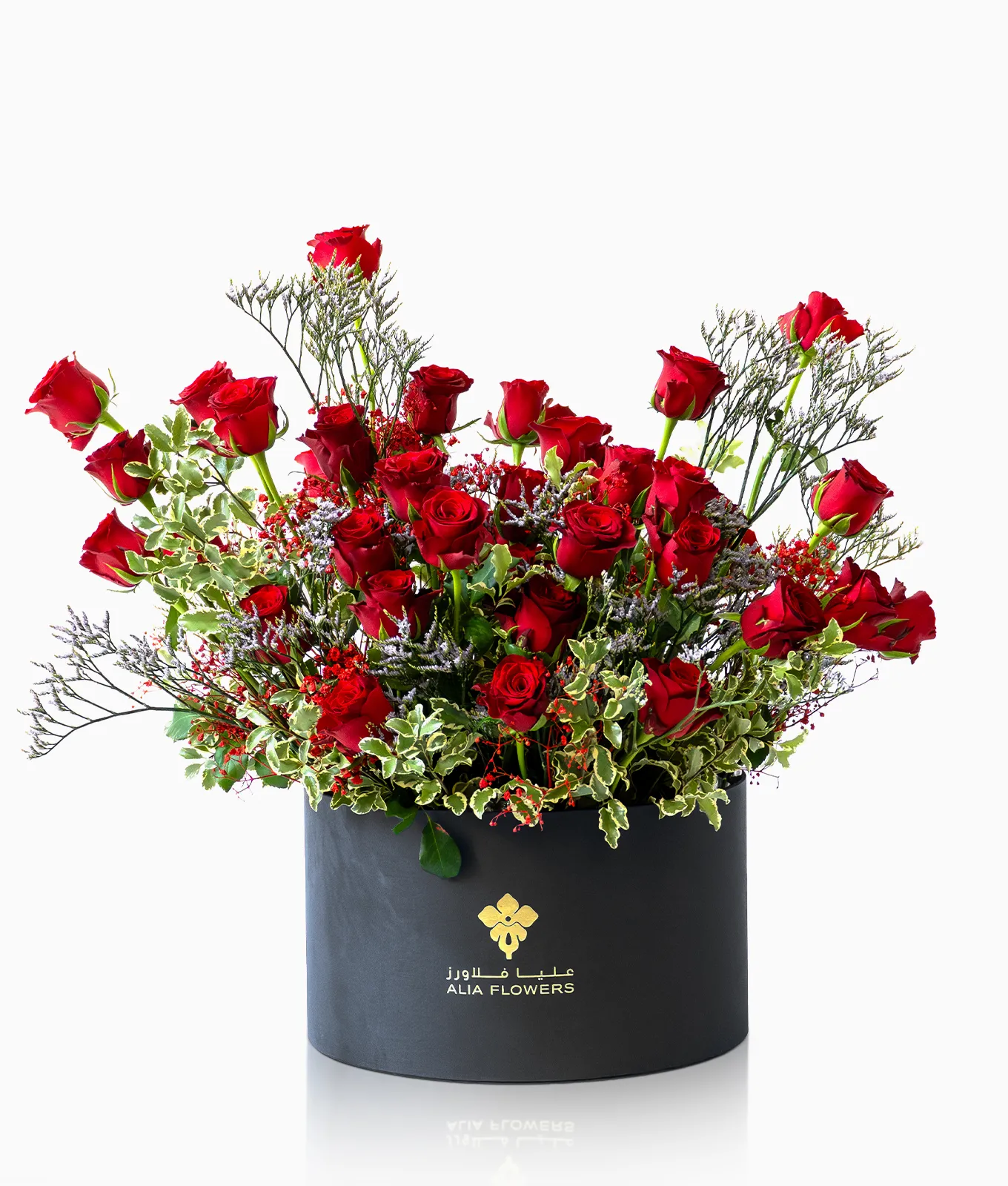 Housed in a signature Alia Box, the roses are artfully layered with the airy texture of Red Painted Gypsophila and the delicate mist of Purple Limonium. Framed by fresh Pittosporum foliage, this voluminous design is a royal statement piece perfect for the most significant romantic gestures.