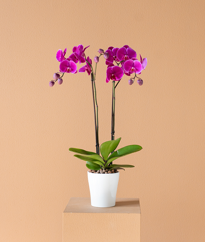 A vibrant purple Phalaenopsis orchid (Phalaenopsis violacea) with two striking stems. Its bold coloration and effortless elegance make it a regal centerpiece for any environment.