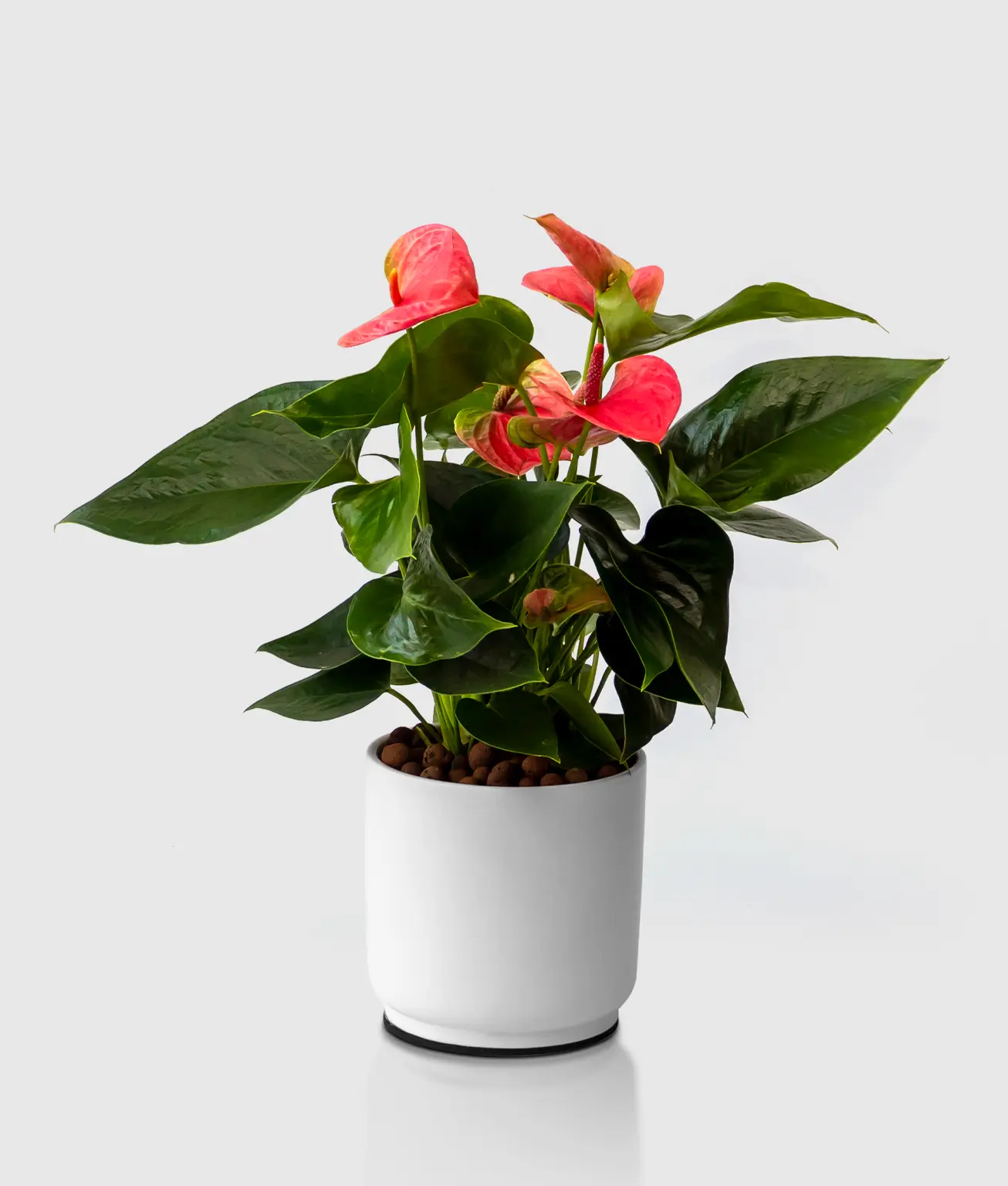 Ruby Aura radiates elegance and tropical charm, bringing a vibrant touch of nature into any space. This stunning anthurium plant, with its glossy red blooms and striking heart-shaped leaves, is beautifully presented in a sleek white ceramic pot that highlights its vivid colors.