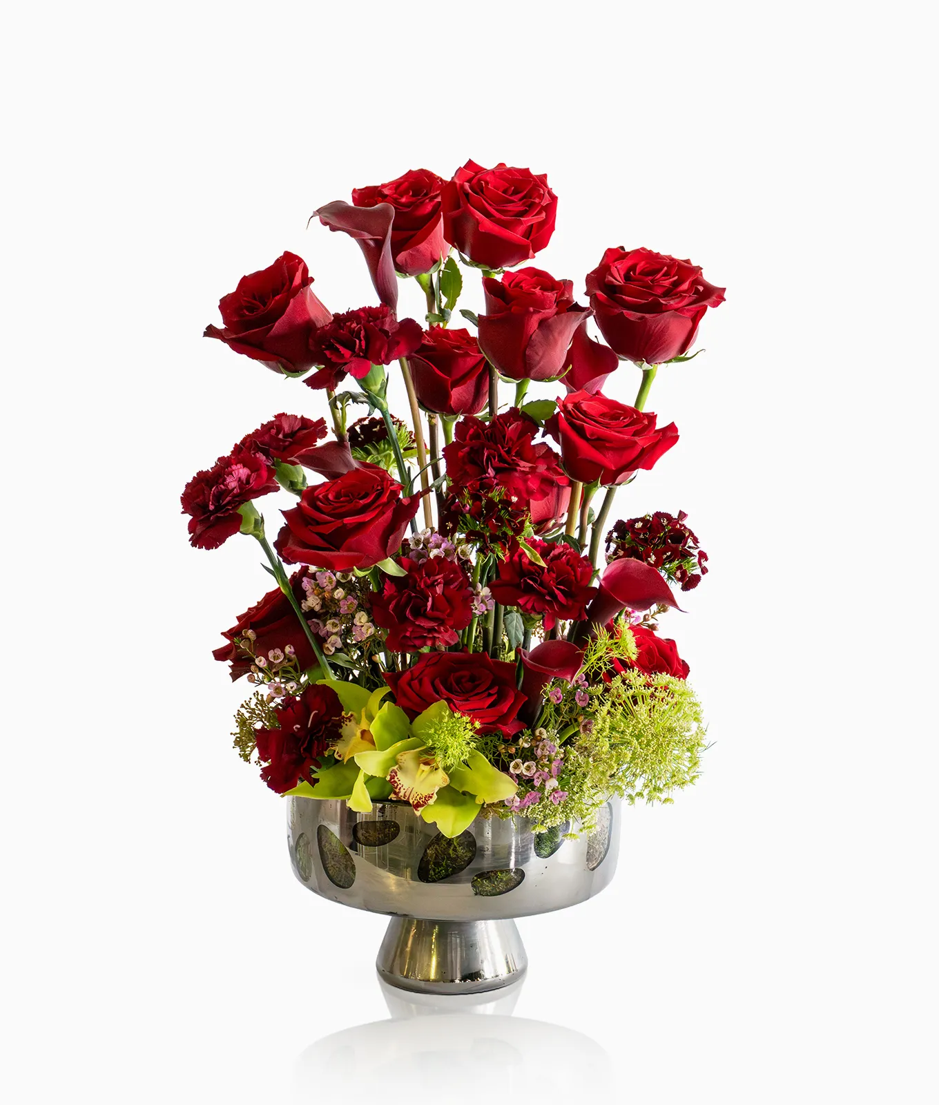 Celebrate love on a grand scale with Ruby Opulence, a magnificent red rose and calla lily arrangement. This high-end design features a centerpiece of premium red roses and velvety red carnations, elegantly contrasted by the structural beauty of sleek calla lilies. Accented with green cymbidium orchids and delicate wax flowers, this luxury Valentine’s Day gift is perfect for those seeking a sophisticated, multi-textured floral experience.