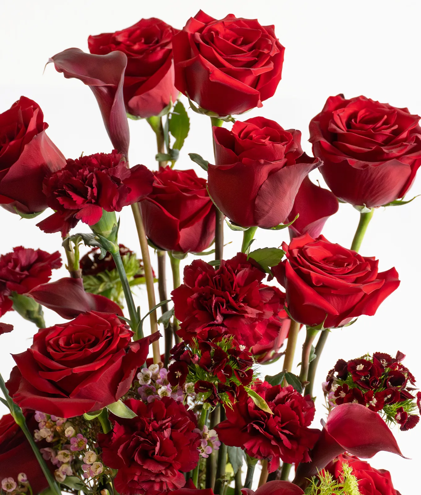 Celebrate love on a grand scale with Ruby Opulence, a magnificent red rose and calla lily arrangement. This high-end design features a centerpiece of premium red roses and velvety red carnations.