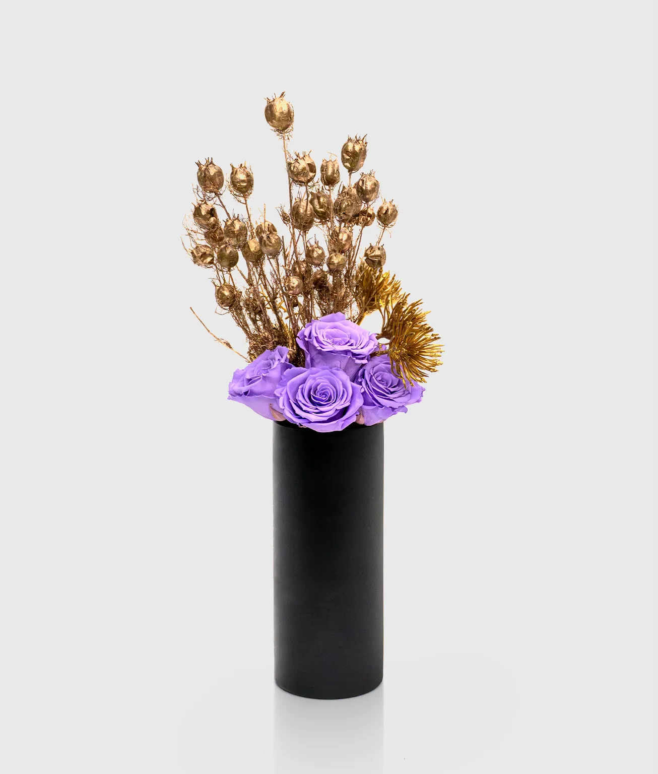 A bold and architectural artificial flower piece featuring a lush, concentrated base of deep purple roses crowned by tall, blue-tinted Salix stems. The striking verticality of the arrangement creates a modern masterpiece that requires no maintenance, serving as an everlasting symbol of admiration and strength. It is a thoughtful way to add a touch of artistic grace to a cherished home.