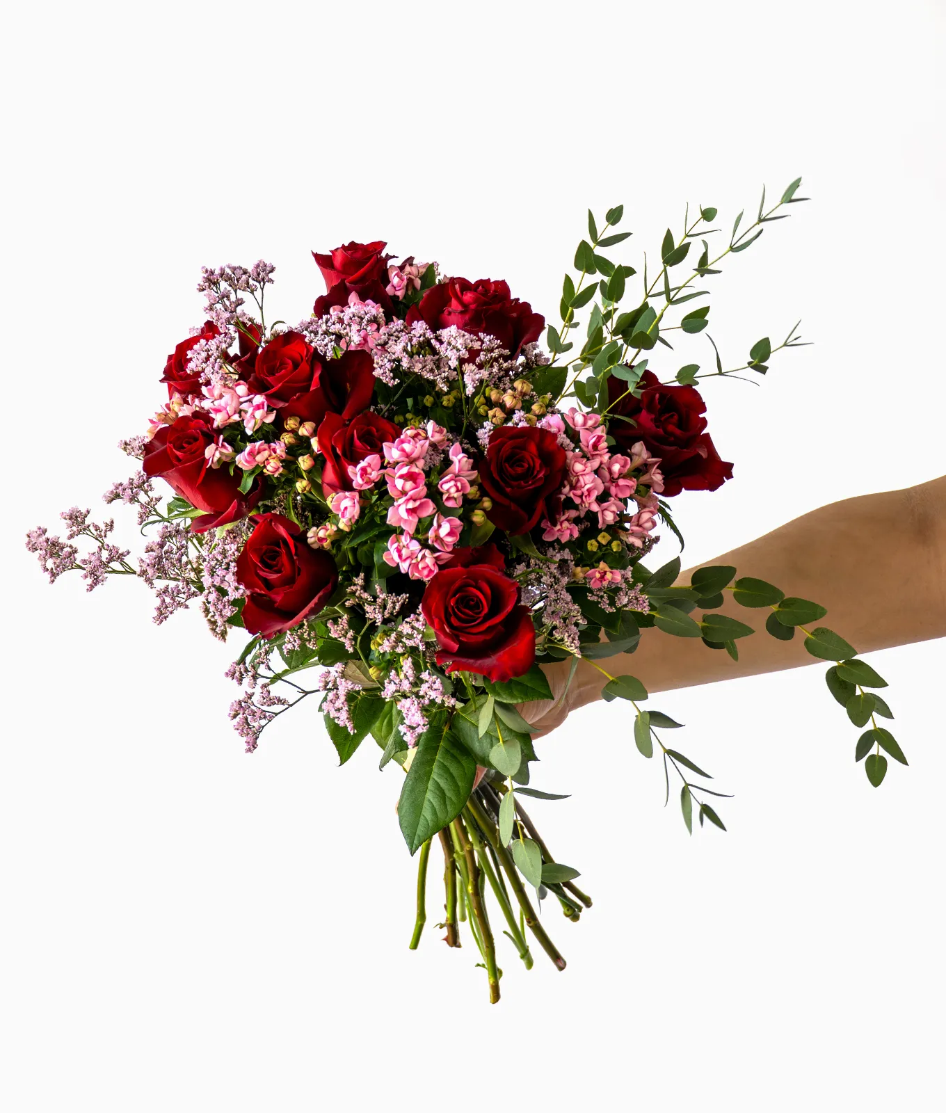 Finished with stems of Eucalyptus for a touch of natural movement and a refreshing scent, this bouquet is an elegant choice for expressing heartfelt sentiment with a light, modern touch.
