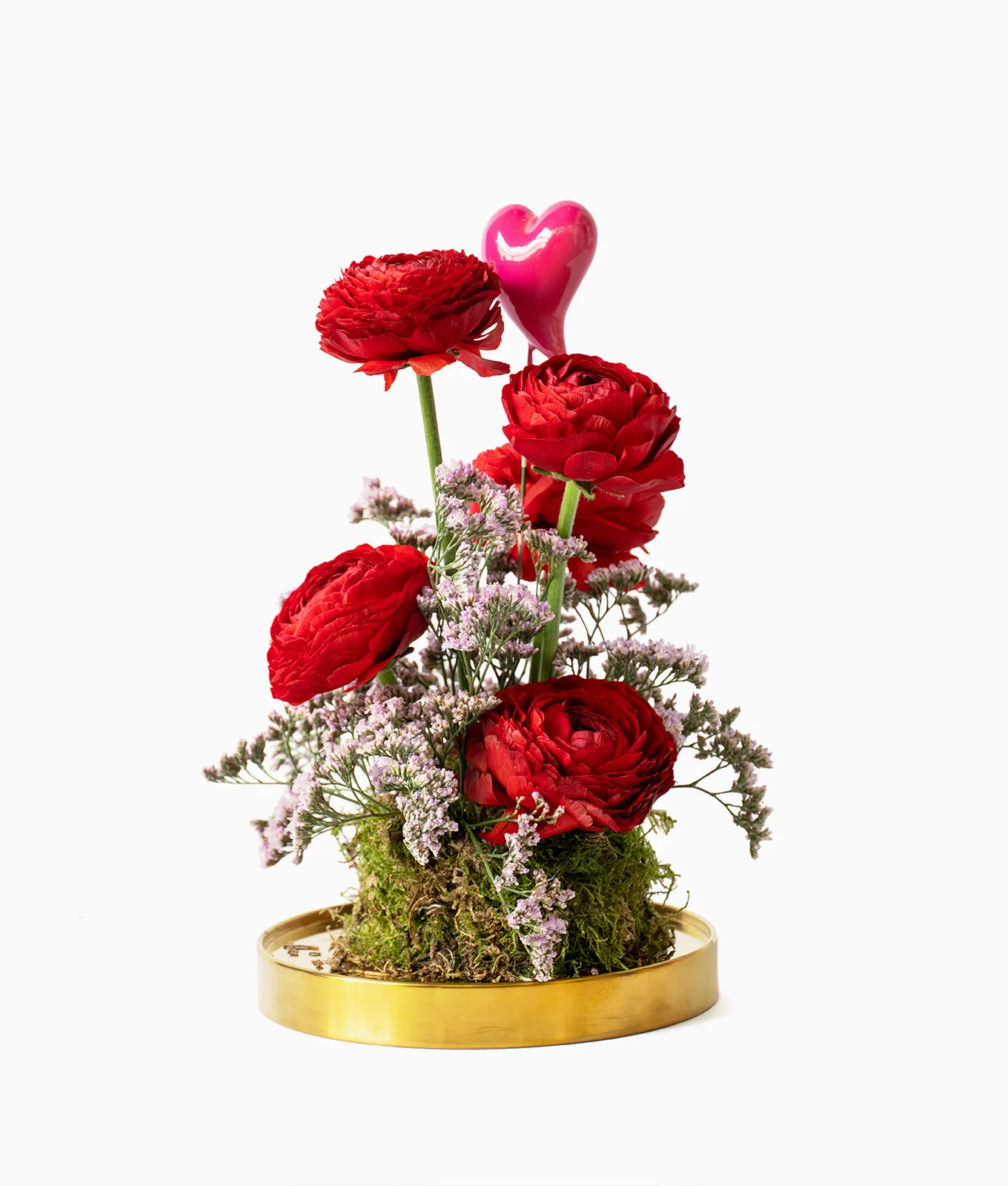 Secret Ember is an enchanting, miniature world captured within a crystal-clear Dome. This delicate arrangement features deep Red Ranunculus, their intricate layers of petals standing in vivid contrast against a bed of natural green moss.